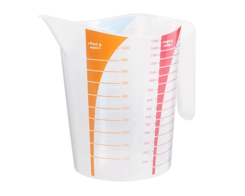 169063 Пластиковый градуированный стакан Aleana 1,5лМерная кружка - это аксессуар, необходимый каждой хозяйке. С ее помощью можно точно измерить количество любых жидких, сыпучих и вязких продуктов. Мерная кружка имеет традиционную круглую форму, удобную тонкую ручку и заостренный носик. Пользоваться мерной кружкой легко и комфортно. Изготовлена мерная кружка из качественного пищевого пластика. Этот легкий и простой в уходе материал отличается износостойкостью, прочностью и экологичностью. Подход ...