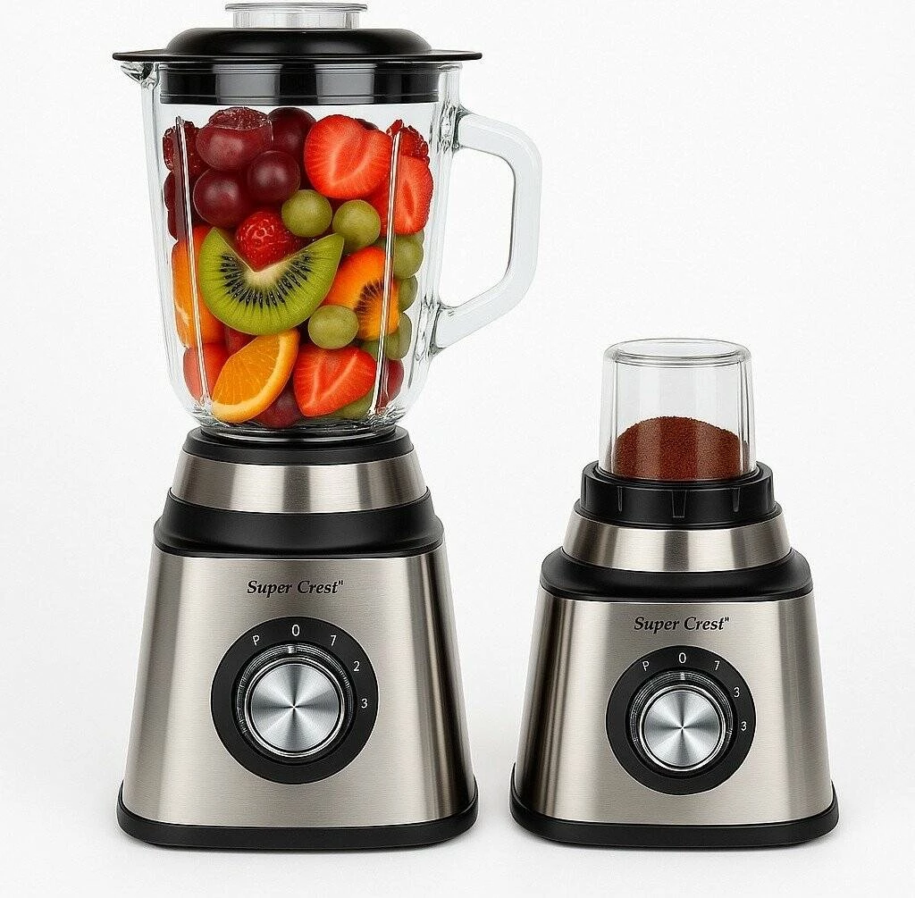Блендер Super Crest — незаменимый помощник на вашей кухне! Легко готовит свежие соки, смузи, крем-супы, пюре, а также измельчает кофе, специи и орехи благодаря насадке-мельнице.