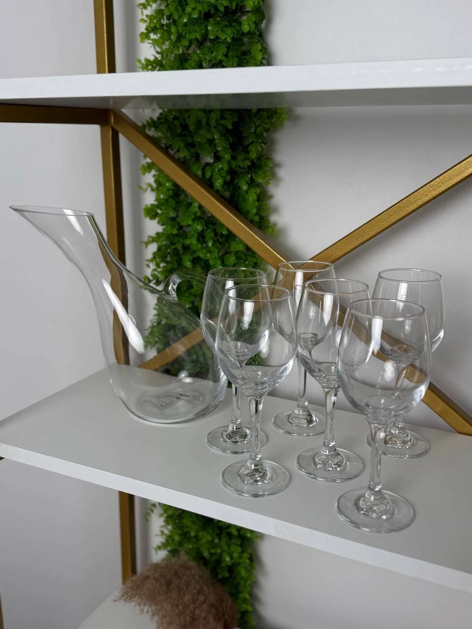 Этот набор предназначен для тех, кто хочет совместить элегантность и функциональность при подаче вина. Декантер из прозрачного стекла разработан для оксигенации вина, усиливая ароматы и утончая вкус, а 6 бокалов на ножке обеспечивают равномерную и профессиональную подачу.