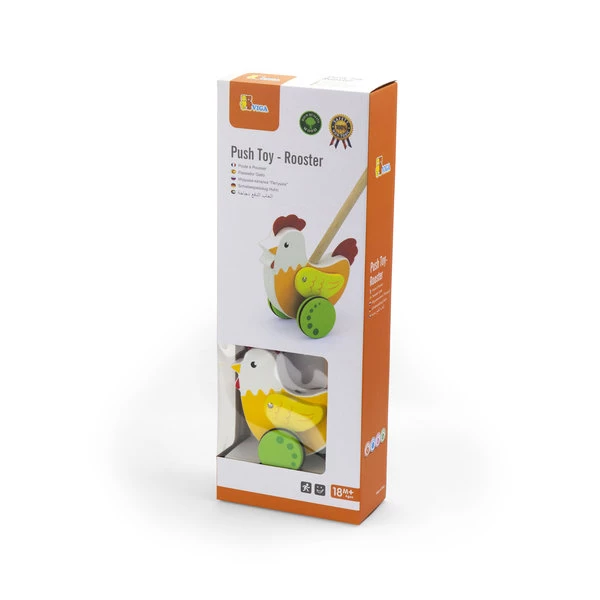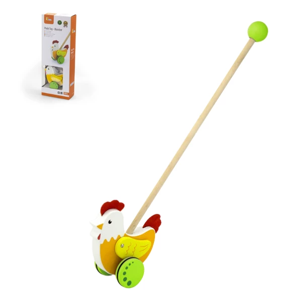 Каталка предназначена для детей от 18 месяцев. Она помогает развивать координацию движений, ловкость и равновесие. Изготовленная из экологически чистой древесины, игрушка покрыта безопасными нетоксичными красками, что делает ее полностью безопасной для малышей.