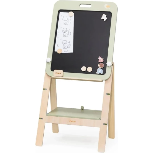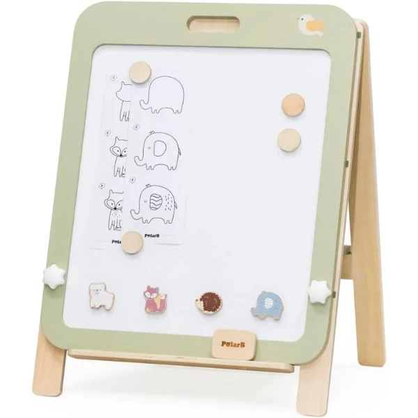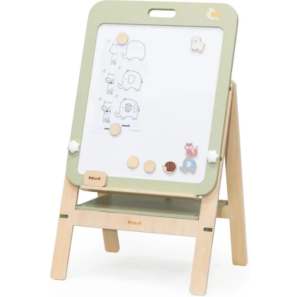 Деревянный мольберт PolarB — это удобный и многофункциональный инструмент для творчества и обучения детей. Мольберт имеет две рабочие поверхности: черную для мела и белую для маркеров, что делает его идеальным для рисования, обучения письму и счету.