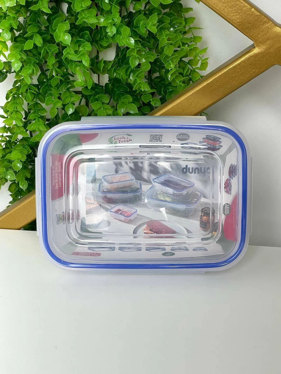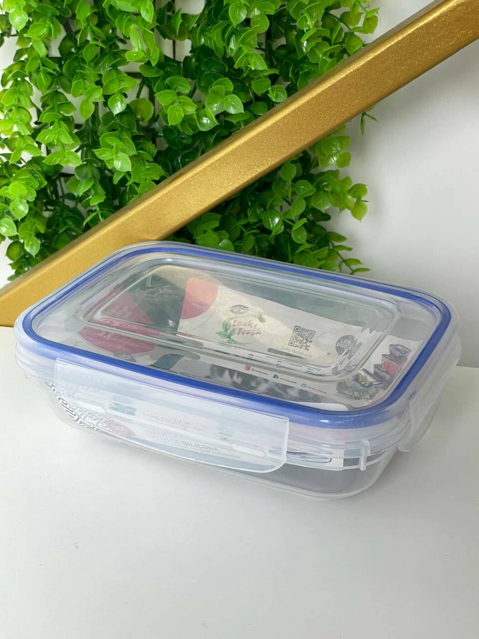 Прозрачный пластиковый контейнер с крышкой и силиконовой прокладкой для хранения продуктов. Обеспечивает герметичное закрытие, сохраняет свежесть, предотвращает протекание жидкостей и попадание воздуха. Можно использовать в холодильнике, посудомоечной машине и микроволновой печи.