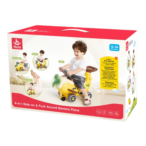 Откройте для ребёнка мир движения и веселья с интерактивным самолётом 4 в 1 «Банан»! Эта яркая и многофункциональная игрушка идеально подойдёт для детей от 12 до 36 месяцев и предлагает сразу четыре режима использования: толокар, ходунок, каталка с родительской ручкой и качалка.