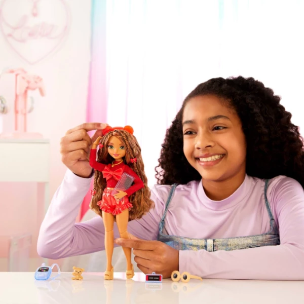 Кукла подвижна и носит съёмную одежду, включая красную кружевную блузку с ярким бантом, шорты и соответствующие туфли.