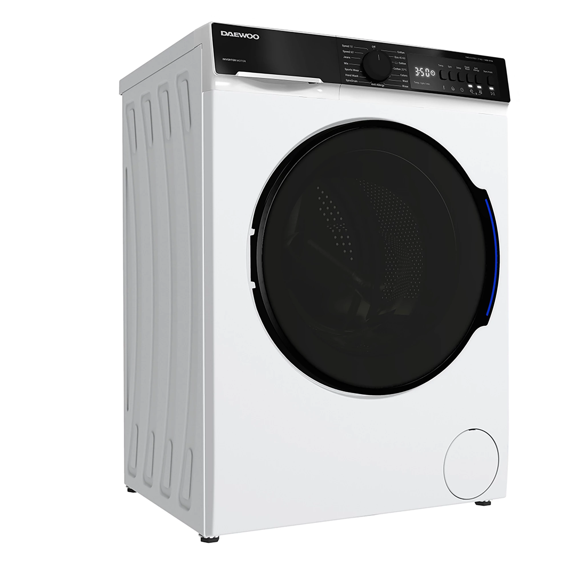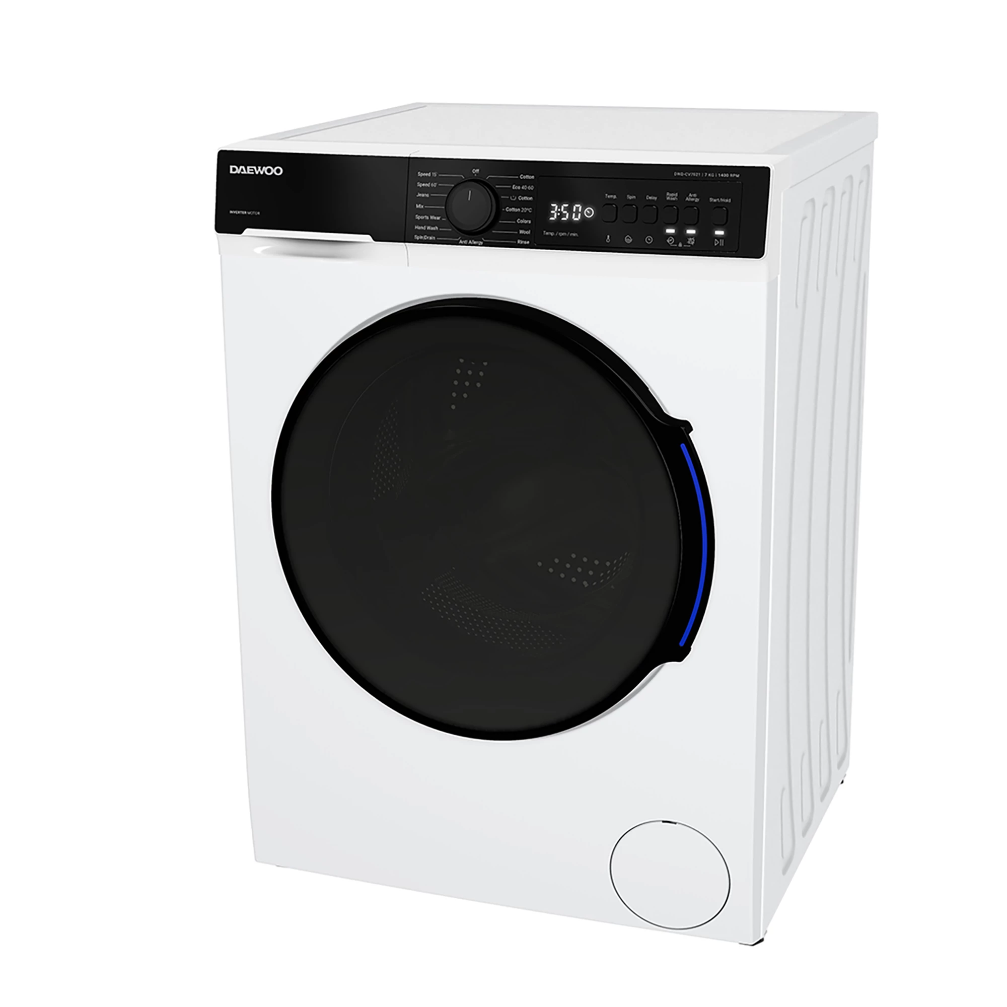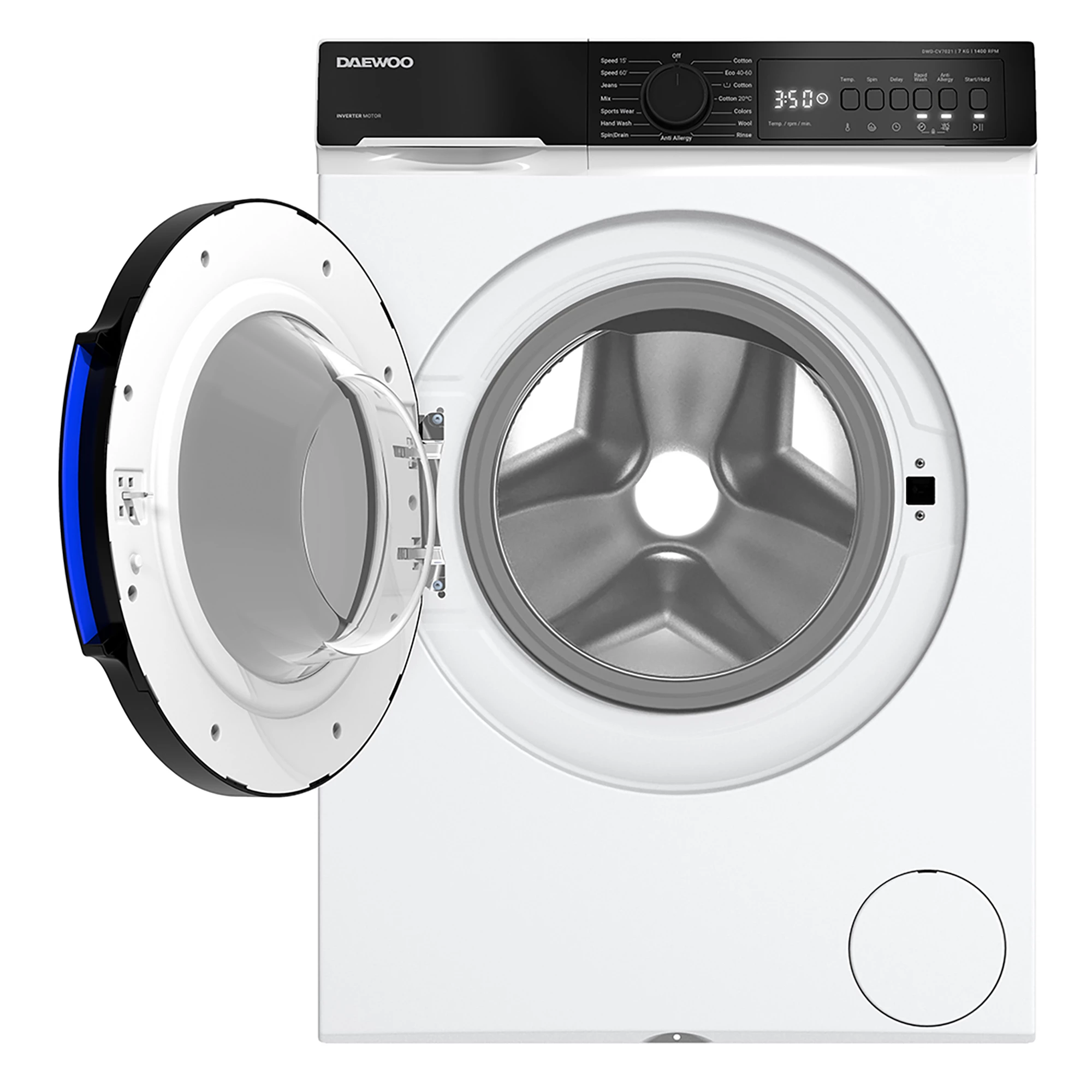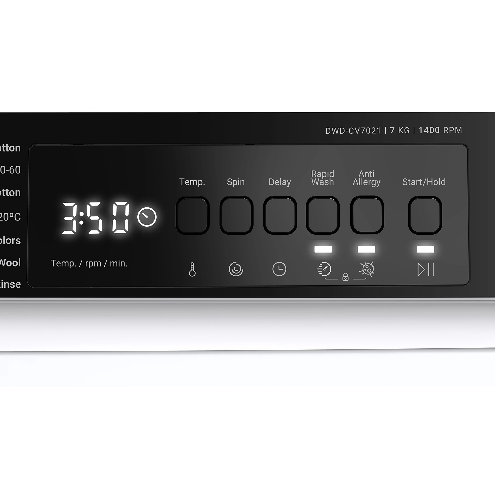 Masina de spalat rufe Daewoo DWD-CV7021, 7 kg / 1400rpm, 53cm, clasa A, motor inverter, Display, Panou negru + usa dubla neagra, 15 program, Alb