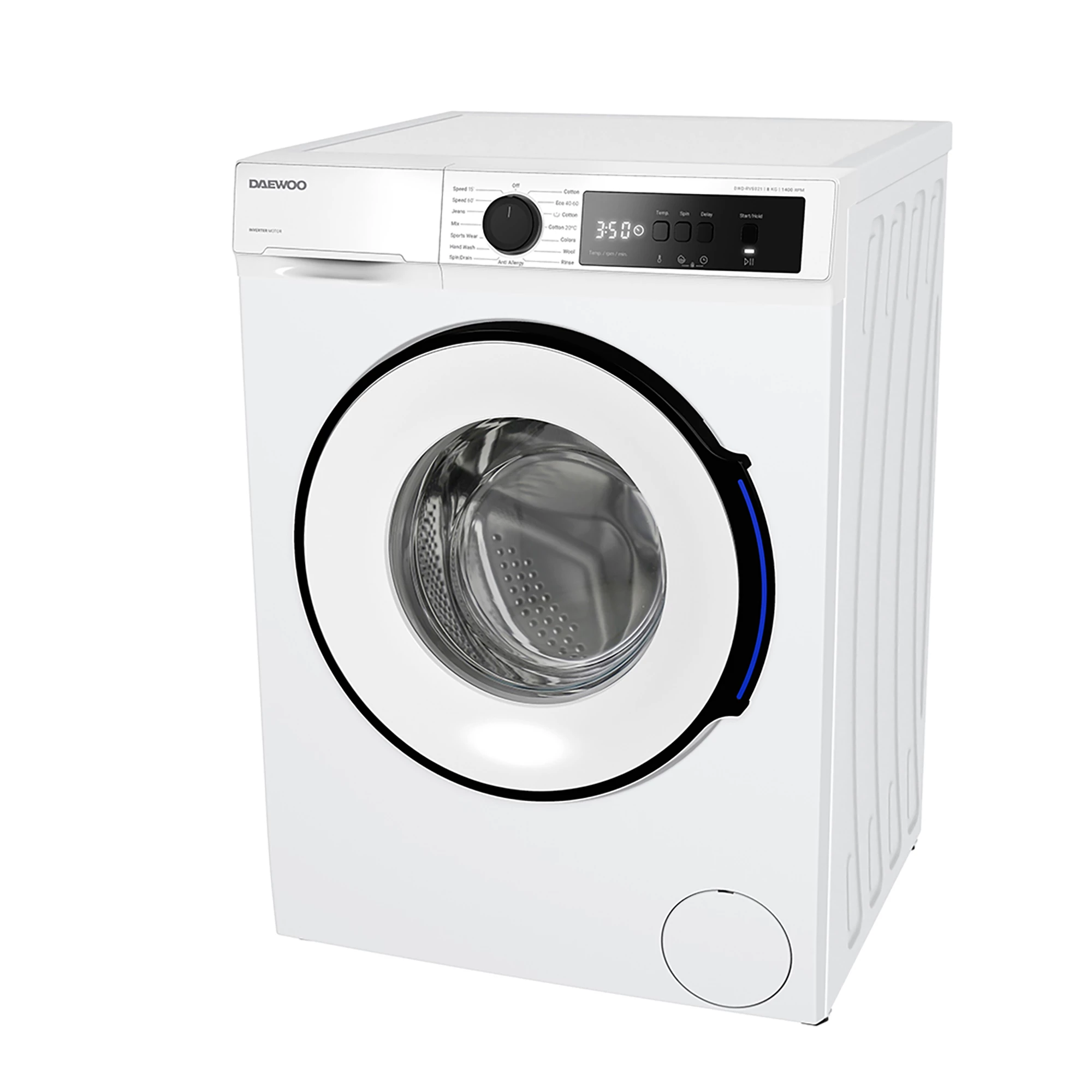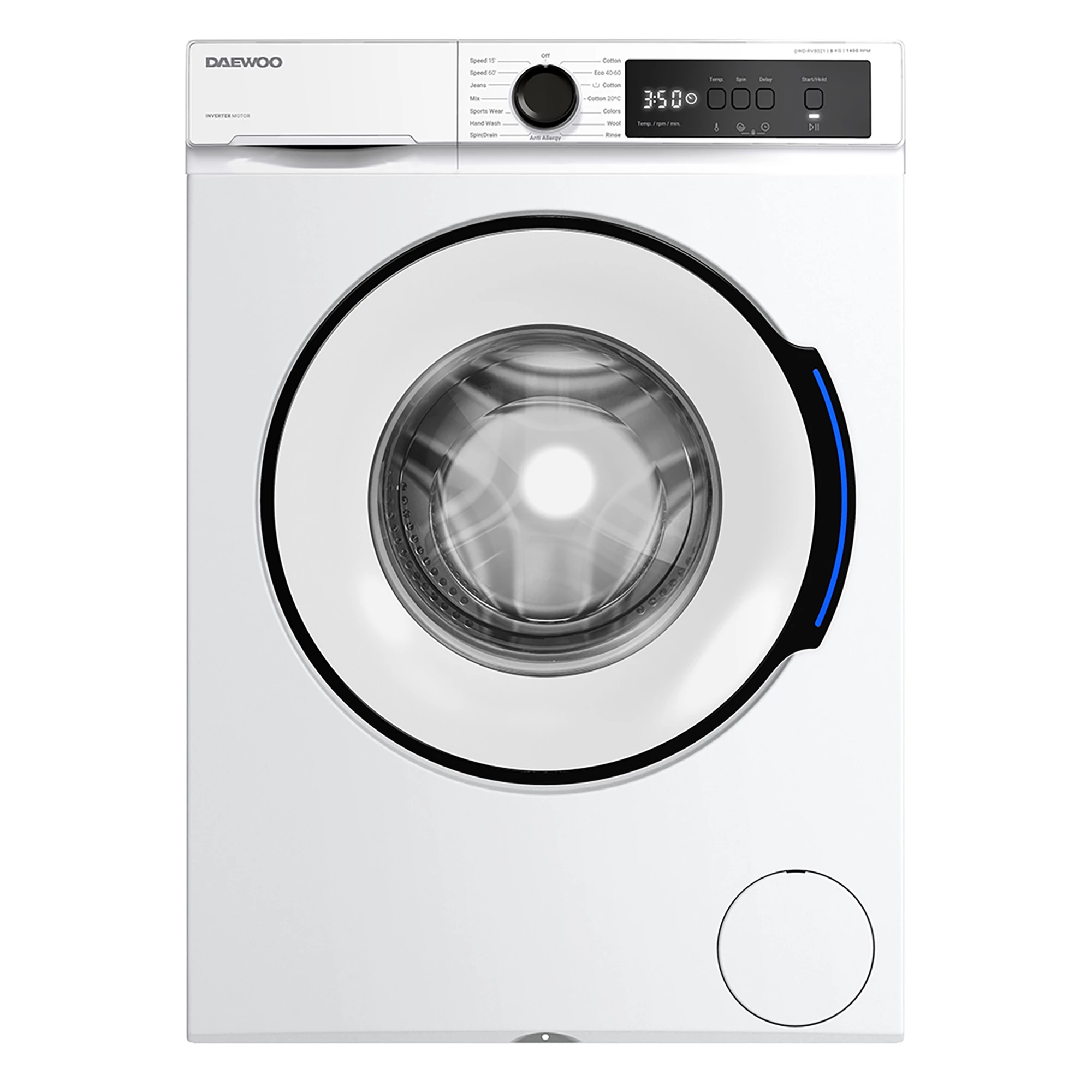 Masina de spalat rufe Daewoo DWD-RV8021, 8 kg / 1400rpm, 53cm, clasa A, motor inverter, Display, buton rotativ negru + usa cu inel negru, 15 program, Alb