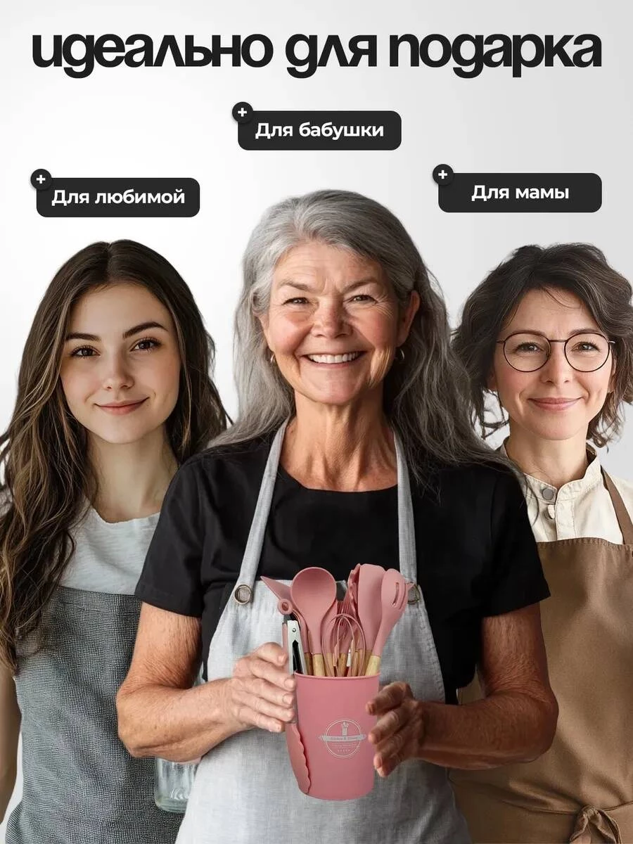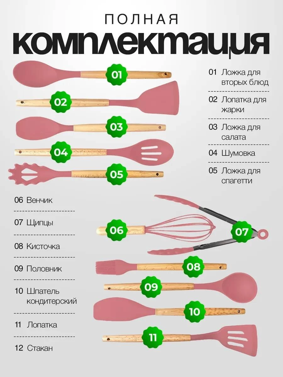 Лопатка, кисточка с острой лопаткой, круглая лопатка, поварешка, прямая лопатка, ложка, щипцы, вилка для пасты — идеально подходят для любых блюд и способов приготовления.