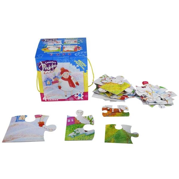 Забавные картинки из жизни семейства овечек Паффи малыш сможет собрать с помощью пазла «Семейка Паффи» (Strateg 20169). В наборе четыре пазла разной степени сложности – от 2х2 до 4х3, размеры элементов – от 12.5 до 6.2 см. На ярких, цветных картинках показаны приключения героев в разные времена года. В собранном виде будет отличным украшением детской.