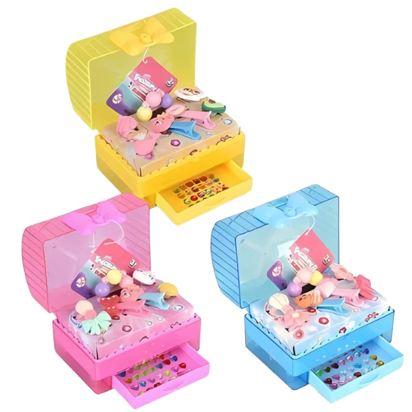 Этот великолепный набор для маленьких модниц включает в себя один браслет, две заколки для волос с милыми зверюшками, два колечка и две резинки для волос. Все аксессуары хранятся в красивом пластиковом сундуке, доступном в трех ярких цветах, который обязательно понравится ребенку. Это идеальный способ для малышей начать коллекционировать украшения и экспериментировать с разными стилями.