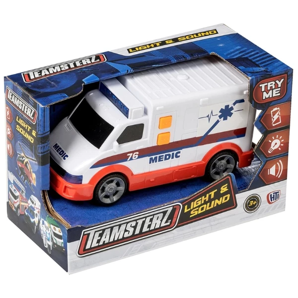 Ambulanța Teamsterz - este o jucărie cu efecte de lumină și sunete, care oferă copiilor ore întregi de distracție captivantă. Prin apăsarea butonului, se activează luminile albastre intermitente, sunetele de sirenă, motor și faruri, creând atmosfera unei intervenții reale de salvare.