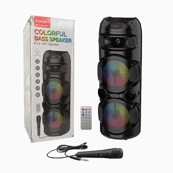 Boxa portabilă ZQS2801 este alegerea perfectă pentru petreceri, karaoke, evenimente și utilizare acasă. Difuzoarele duble de 8 inch oferă un sunet puternic și clar, iar luminile RGB creează o atmosferă de party. Se conectează rapid prin Bluetooth 5.2, USB, AUX sau card TF, iar bateria încorporată permite utilizare fără fir oriunde ai nevoie. Include microfon cu fir și telecomandă pentru control ușor.