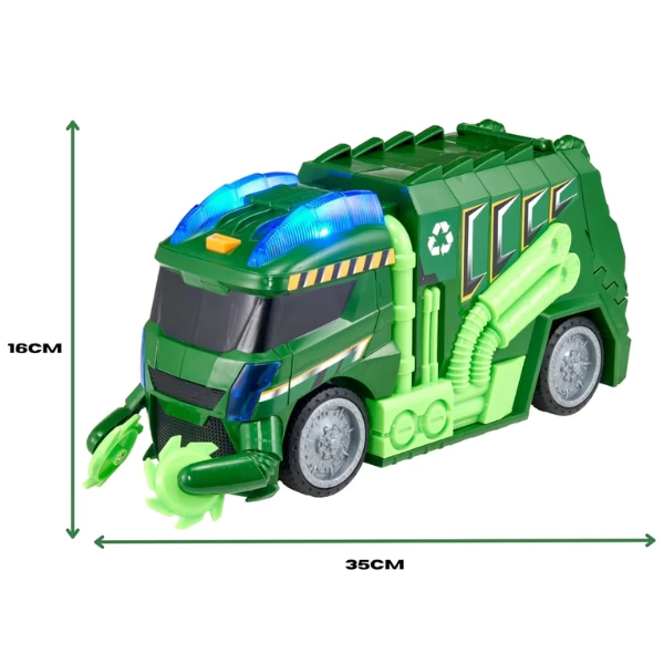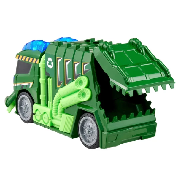 Efecte luminoase și sonore: prin apăsarea butonului se activează luminile albastre intermitente, muzica, sunetele motorului și cele specifice unui camion de reciclare. ...