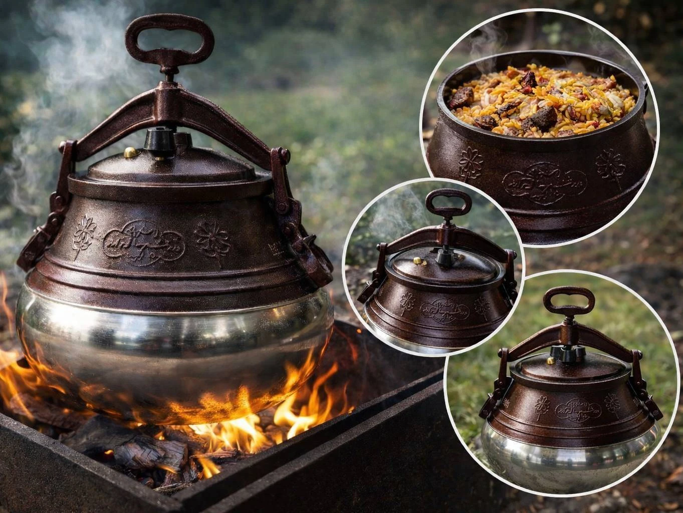 Ceaun sub presiune Afgan cu acoperire inox/maro, material - aluminiu. Dispozitiv de inalta calitate, buton de siguranta, buton de a eliberare aburului. Cazanele afgane functioneaza pe principiul oalei sub presiune - economisesc timp pregatind produsul mai repede, pastreaza vitaminele. Acestea difera de oale sub presiune conventionale in grosimea metalului, forma rotunda si dispozitivul de prindere.