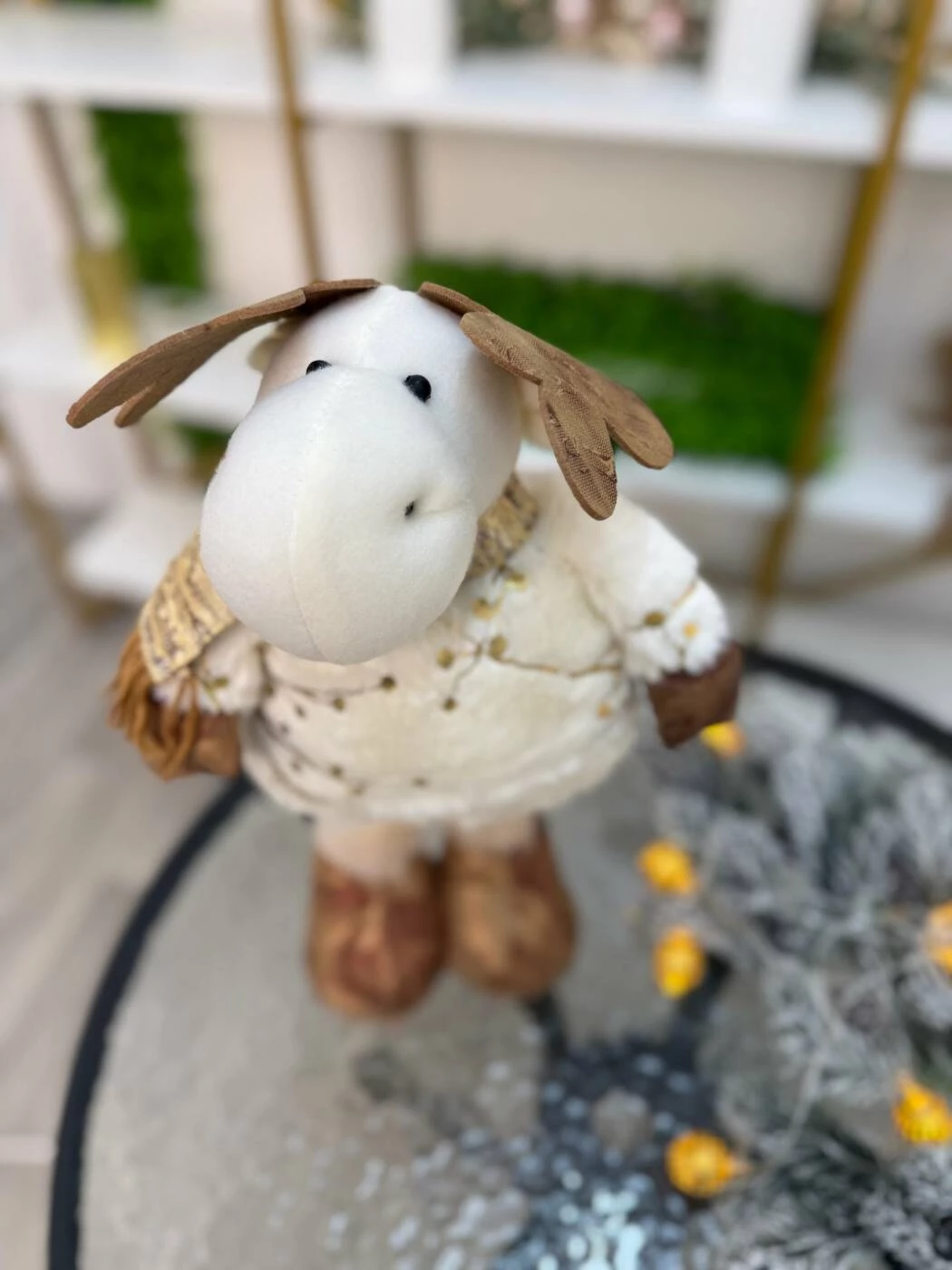 Un decor plin de personalitate, perfect pentru a aduce farmecul sărbătorilor în casa ta. Acest ren decorativ din material textil este îmbrăcat într-o ținută de iarnă rafinată, în nuanțe de crem și auriu, completată de un fular asortat și pantofi.