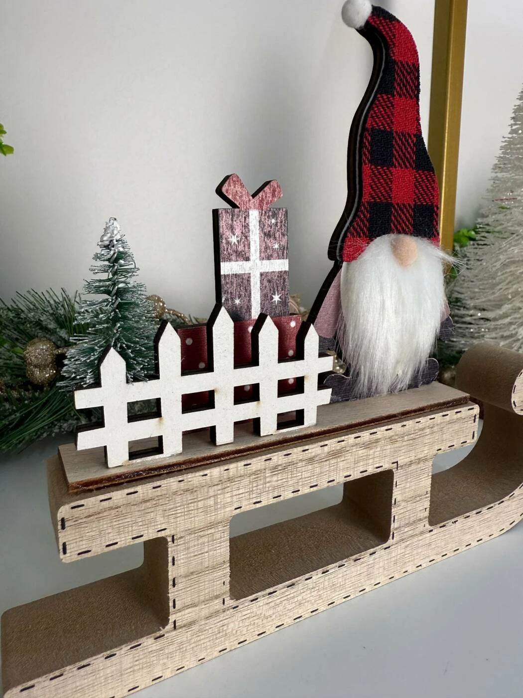Această decorațiune de Crăciun îmbină stilul rustic cu farmecul tradițional al sărbătorilor. Confecționată din lemn, sania este decorată cu un mic brăduț, un cadou festiv și o figurină Moș cu pălărie roșie în carouri, aducând un aer cald și autentic oricărui colț al casei.