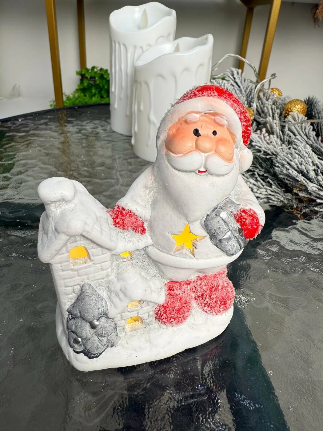 O figurină decorativă plină de farmec, perfectă pentru a aduce magia sărbătorilor în casa ta! Această decorațiune din ceramică îl înfățișează pe Moș Crăciun alături de o căsuță acoperită de zăpadă, luminată discret din interior pentru un efect cald și festiv. Realizată cu atenție la detalii și finisaje, decorațiunea se potrivește ideal pe masă, raft sau vitrină, oferind un accent elegant și tradițional decorului de Crăciun.