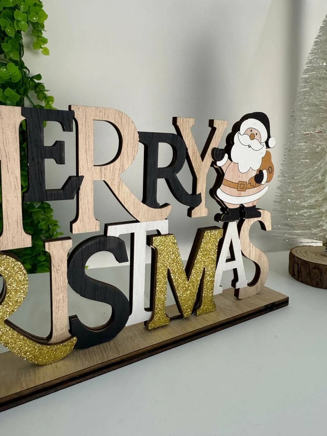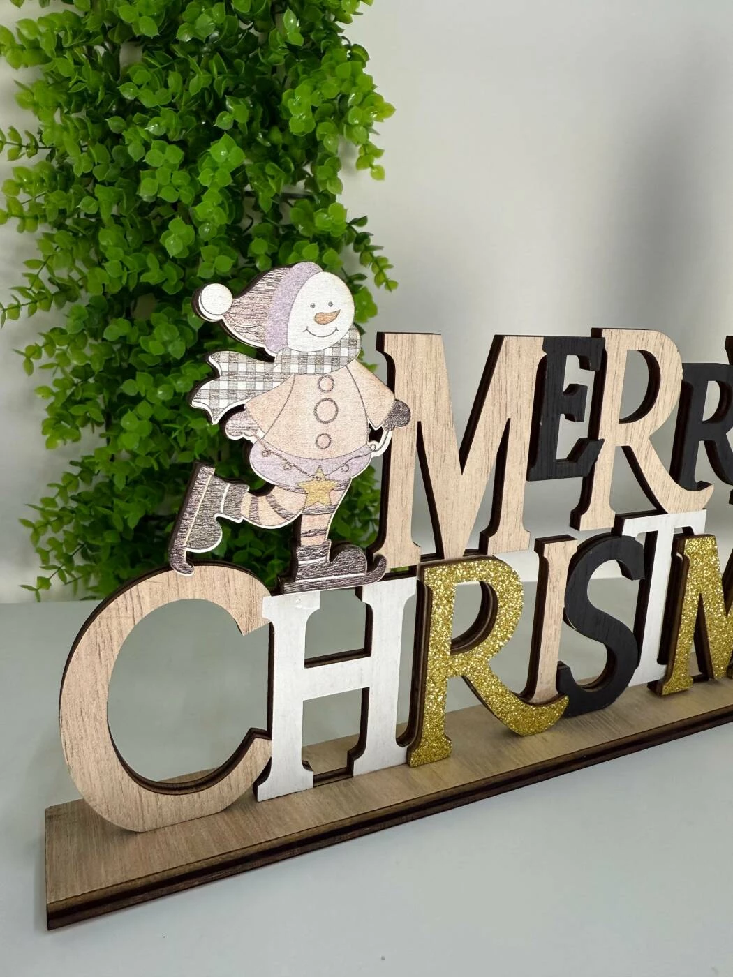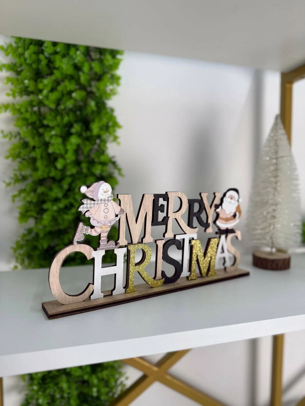 O decorațiune elegantă de Crăciun, realizată din lemn de calitate, perfectă pentru a aduce spiritul sărbătorilor în casa ta. Textul „MERRY CHRISTMAS” este decorat cu sclipici auriu, iar marginile sunt completate de figurine simpatice de Moș Crăciun și om de zăpadă. Ideală pentru rafturi, mese, birouri sau vitrine.