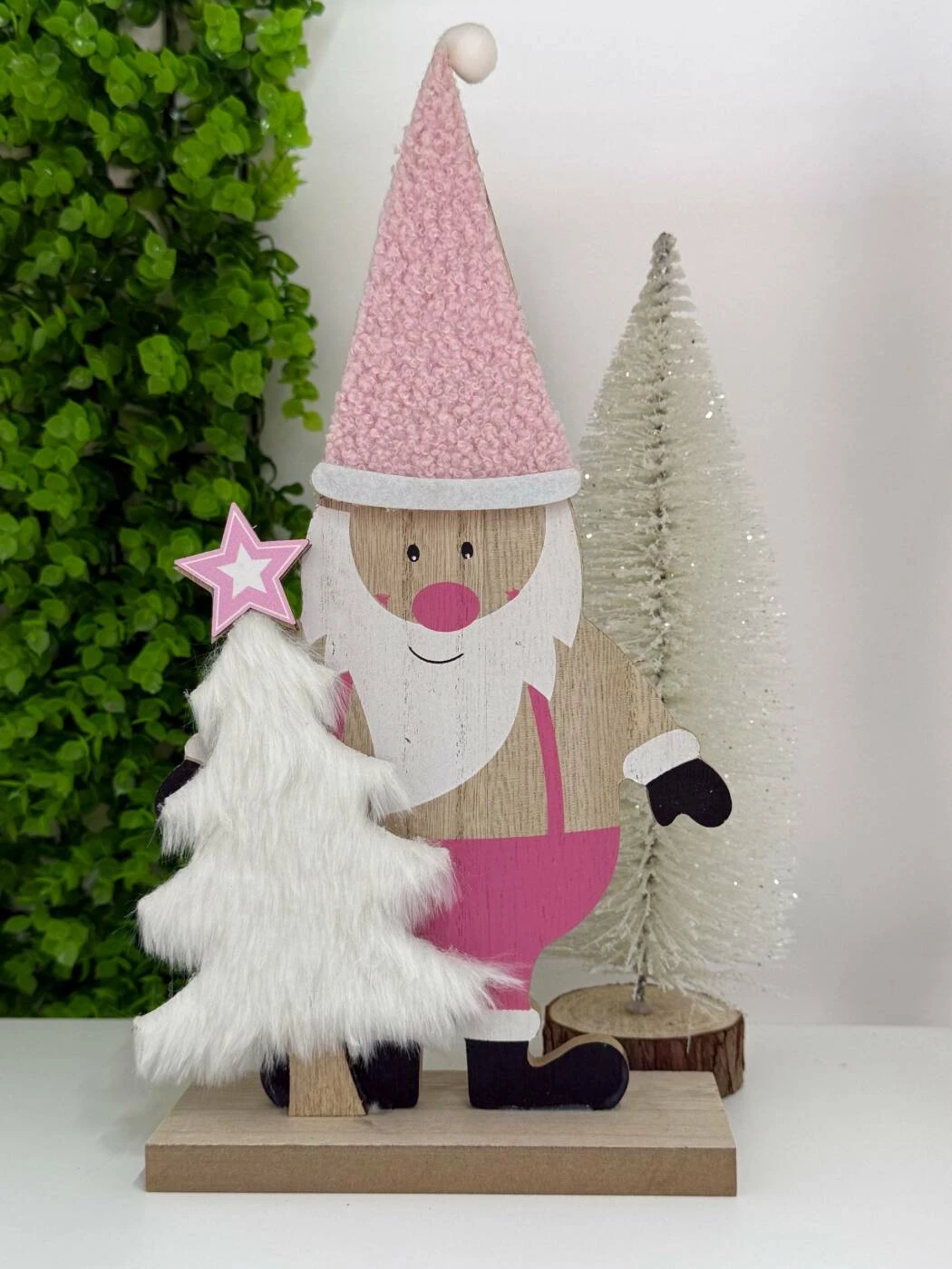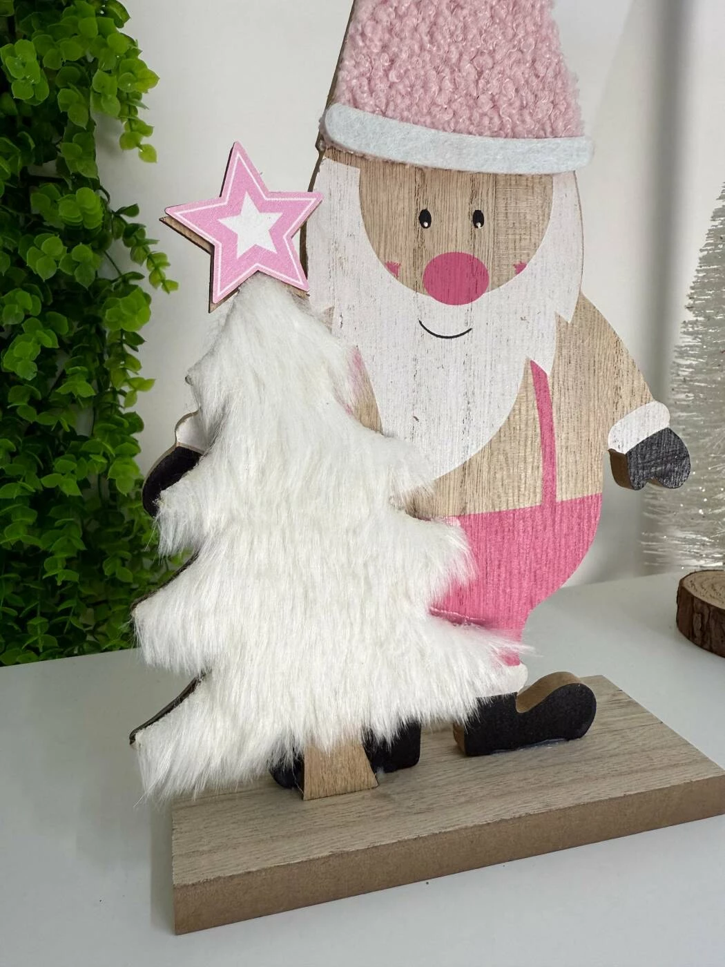 Această decorațiune adorabilă din lemn îl înfățișează pe Moș Crăciun într-o variantă modernă, cu o pălărie roz și un brăduț acoperit cu material moale, tip blăniță, care adaugă o textură plăcută și un aspect rafinat.