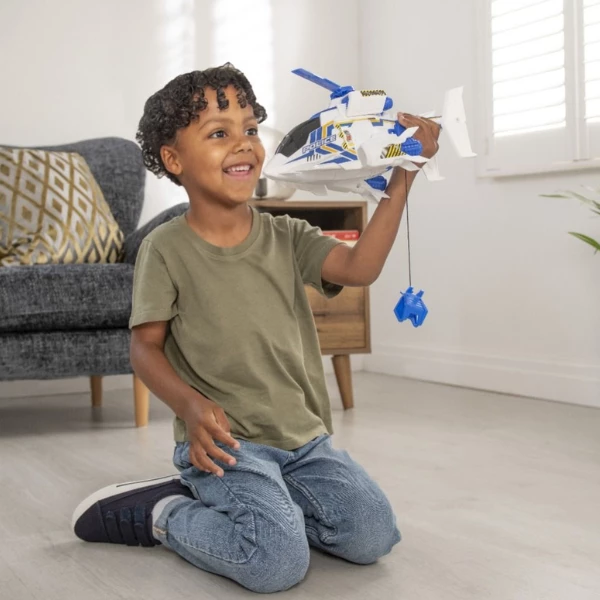 Elicopter de poliție Teamsterz Mean Machines, cu lumină și sunet - este o jucărie interactivă modernă, care oferă copiilor o experiență captivantă de zbor și misiuni de salvare. Designul său futurist, cu „motoare cu reacție”, îl face extrem de atractiv pentru micii pasionați de tehnică și aviație.