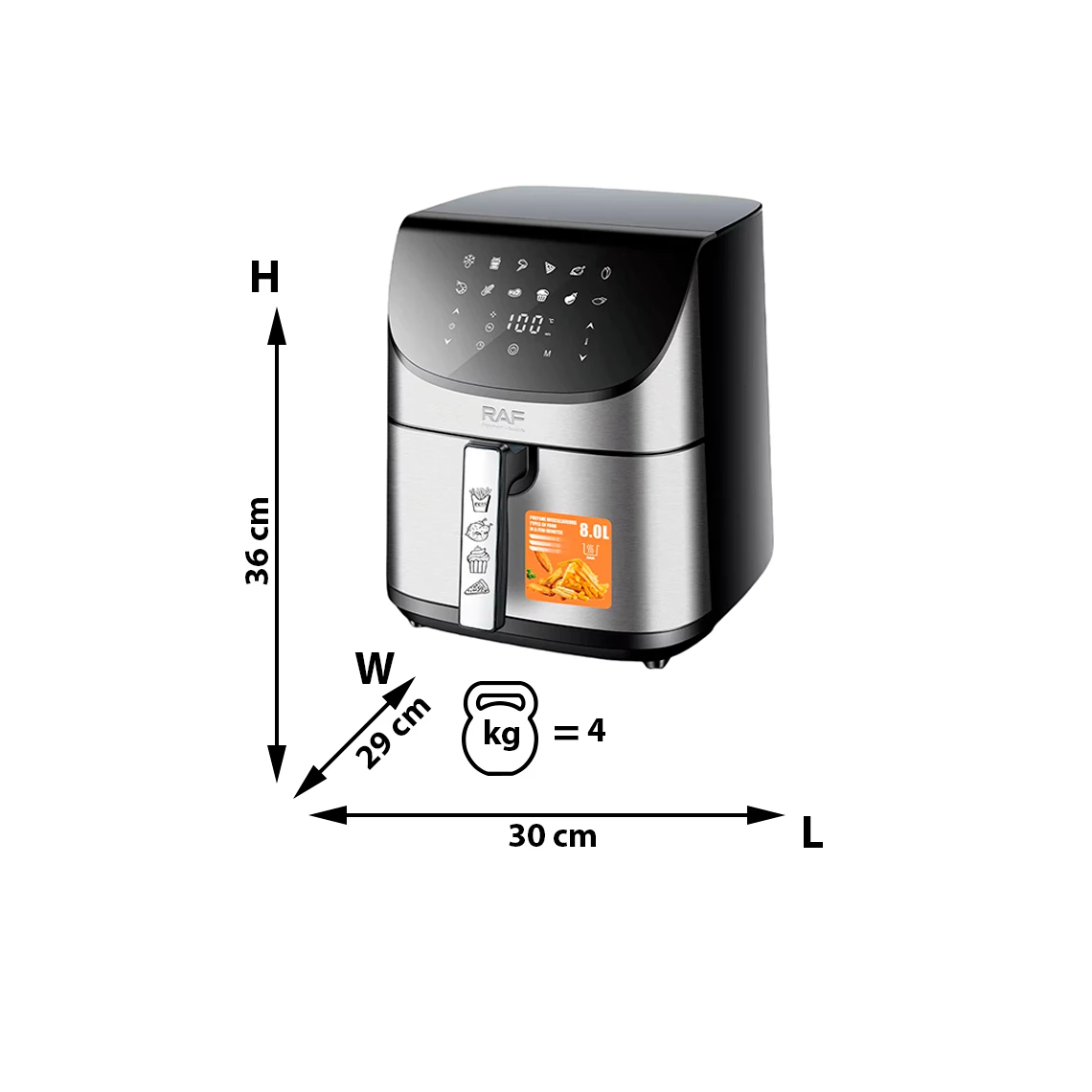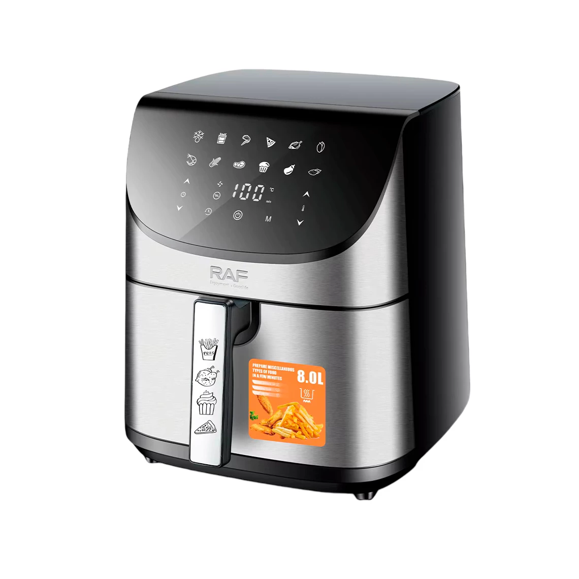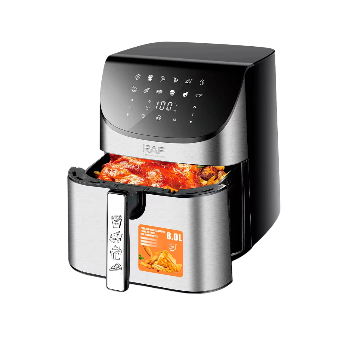 Friteuza cu aer RAF Air Fryer 8L 2000W este un aparat electrocasnic modern care îți permite să prepari mâncare crocantă și delicioasă, folosind cu până la 80% mai puțin ulei. Cu ajutorul circulației de aer fierbinte la 360°, alimentele se gătesc uniform și rapid, păstrând o textură crocantă la exterior și suculență la interior.