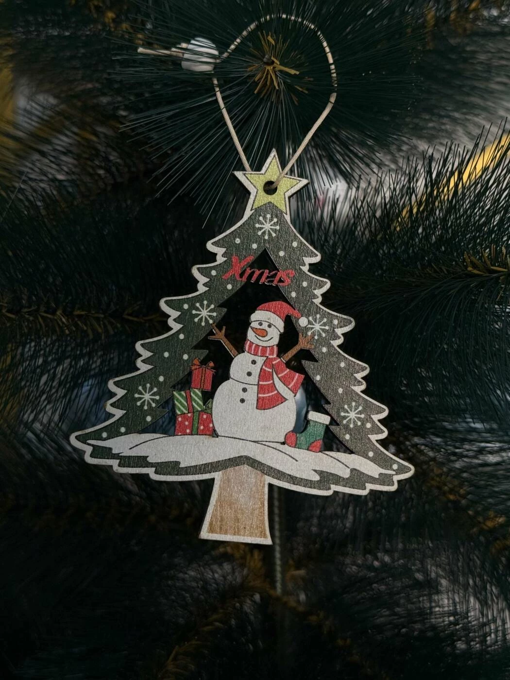 Adaugă o notă de veselie și farmec bradului tău cu acest glob decorativ din lemn, în formă de brad, decorat cu un simpatic om de zăpadă și cadouri colorate. Realizat cu atenție la detalii, accesoriul aduce spiritul autentic al sărbătorilor chiar în casa ta.