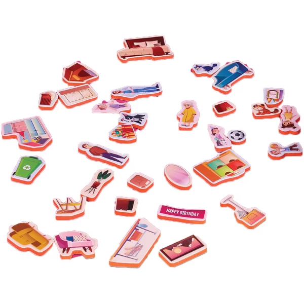 Plasați și mutați diferite aparate electrocasnice, mese, canapele, mobilier, jucării și obiecte decorative în fiecare cameră și creați concepte diverse în funcție de imaginația voastră. Cu personajele din familie, încadrați în decor, puteți imagina mii de povești. Datorită tablei magnetice speciale, jocul poate fi jucat cu plăcere chiar și în timpul călătoriilor lungi. În afară de tabla decorată, jocul poate fi folosit pe suprafețe metalice, cum ar fi frigiderele.