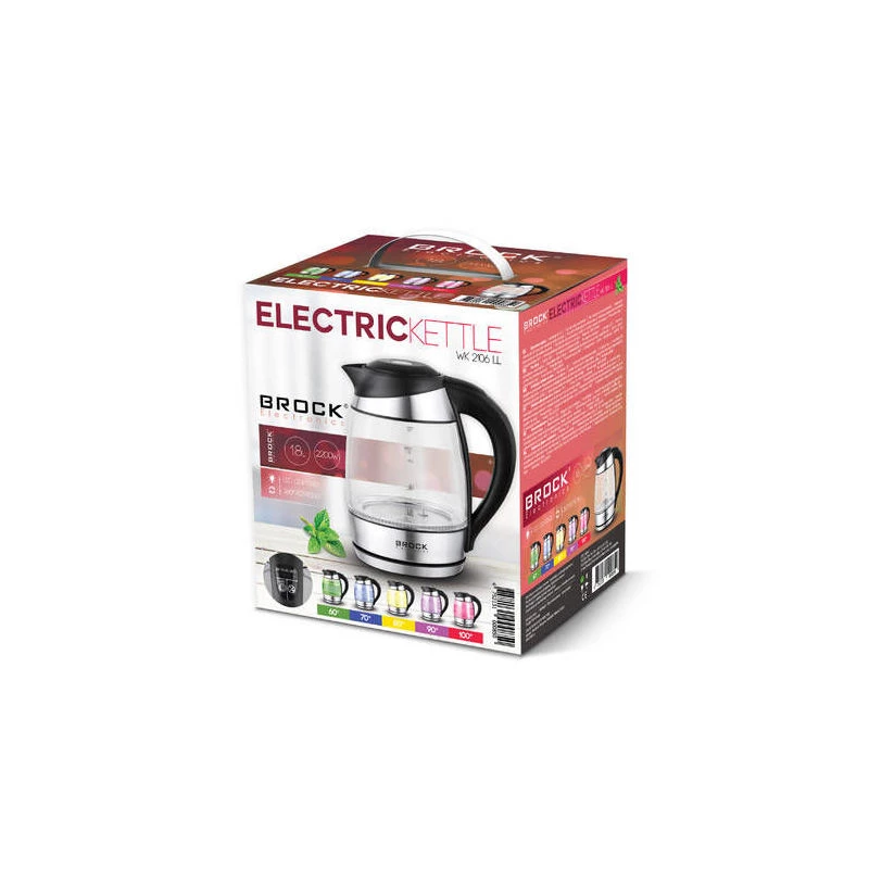 Kettle BROCK WK 2106 LL, Glass Black with LED light and temperature controller 2200W, 1.8L, The kettle will heat the water up to 60°C, 70°C, 80°C and