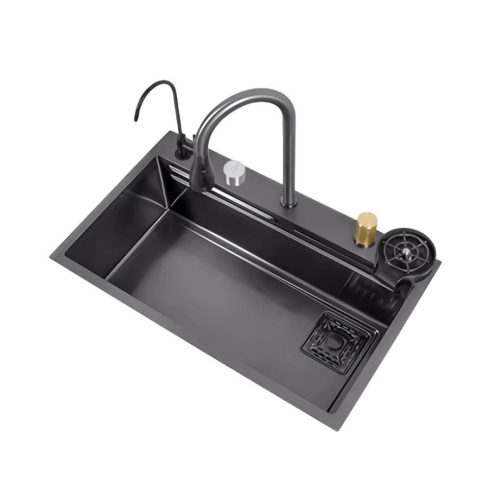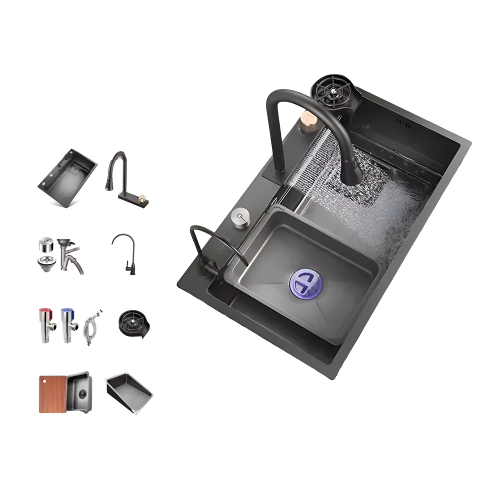 Caracteristica sa multifunctionala o face extrem de utila in viata de zi cu zi. Este prevazuta cu sistem waterfall incorporat, care permite o distributie uniforma si eleganta a apei, imbunatatind atat aspectul estetic, cat si experienta de utilizare. Dimensiunile generoase de 680*450 mm ofera spatiu amplu pentru spalarea vaselor, fructelor, legumelor sau pentru alte activitati culinare.