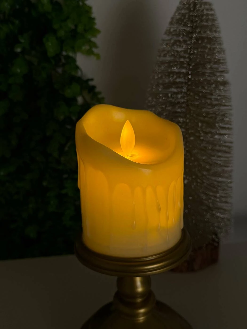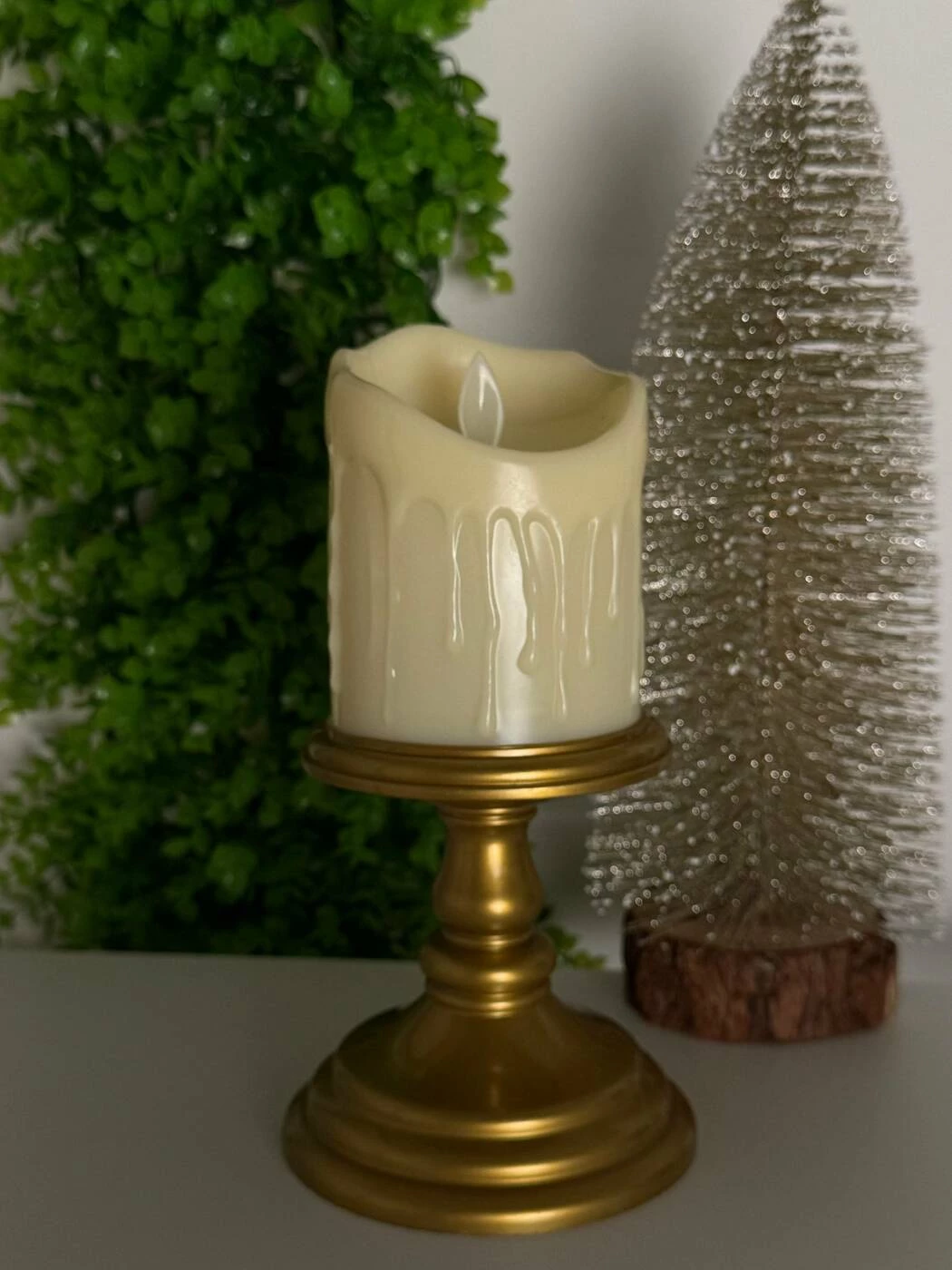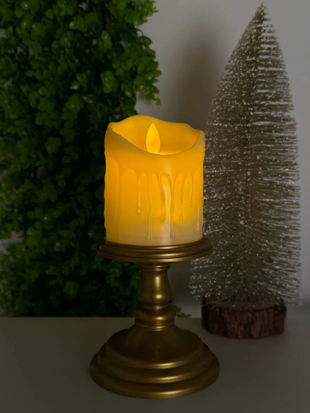 Creează o ambianță caldă și elegantă în locuința ta cu această lumânare decorativă LED montată pe un suport auriu. Designul realist, cu detalii ce imită ceara topită și flacăra naturală, oferă un efect autentic fără fum sau riscuri de ardere.