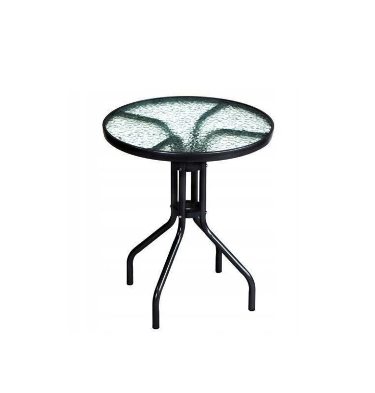 Blatul rotund este realizat din sticlă securizată rezistentă, oferind un aspect modern și elegant, dar și o întreținere ușoară. Structura metalică solidă asigură stabilitate și durabilitate, fiind potrivită pentru utilizare zilnică în aer liber. Masa este concepută pentru a rezista condițiilor de exterior, fiind o alegere potrivită pentru grădini, terase, cafenele sau balcoane.
