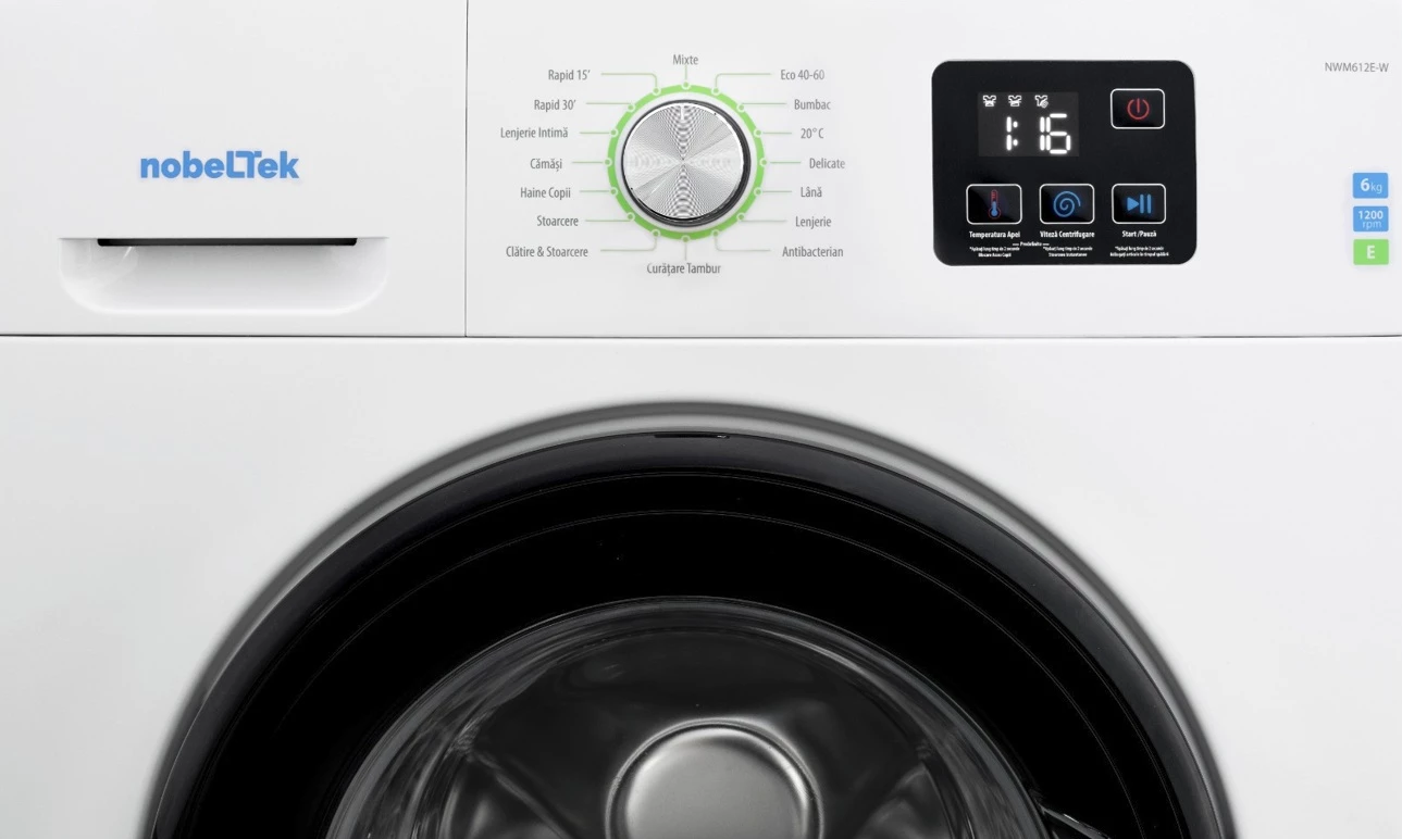 Masina de spalat rufe Nobeltek NWM612E-W, 6 kg / 1200rpm, 44cm, clasa E, functie curatare tambur, program scurt: 15 min, 16 program, Alb