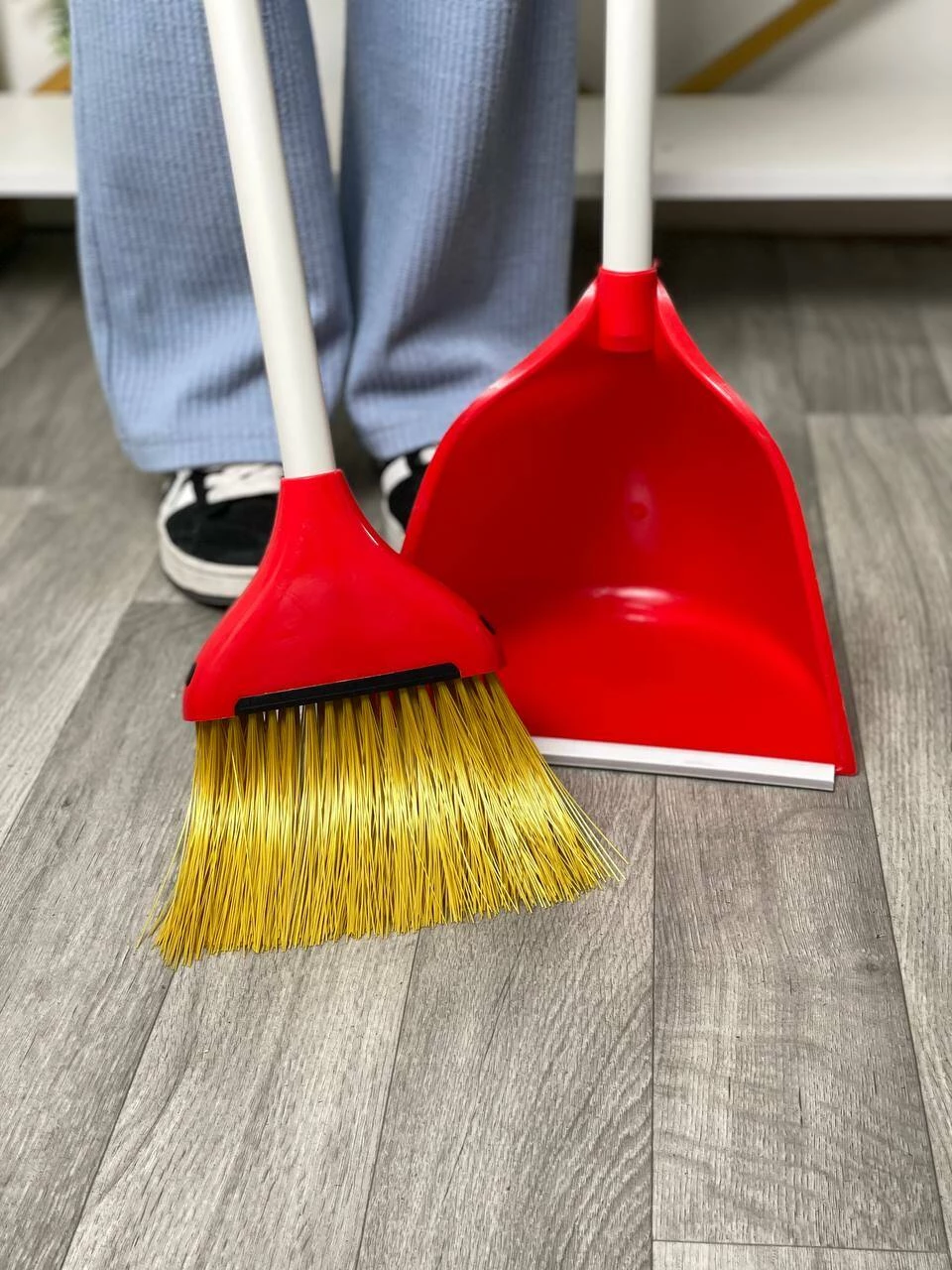 Set practic pentru curățenie zilnică – mătură cu peri rezistenți și făraș ergonomic, ambele cu coadă lungă pentru utilizare comodă, fără aplecare.