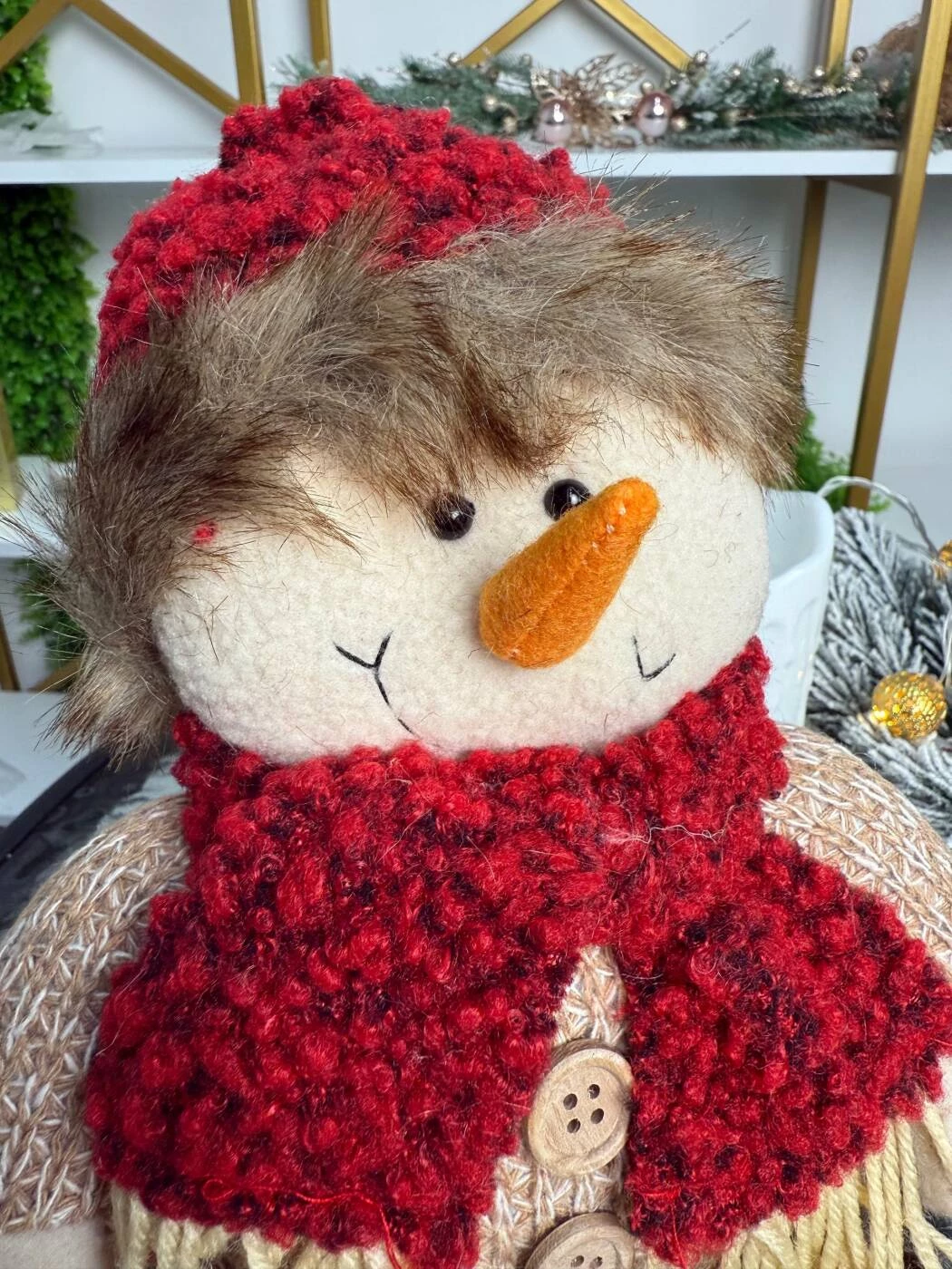 Un decor de iarnă plin de farmec și culoare! Acest om de zăpadă decorativ, îmbrăcat cu o căciulă tricotată și un fular roșu, aduce bucuria sărbătorilor în orice încăpere. Realizat din materiale textile moi, cu detalii atent lucrate — nasturi, nas portocaliu și cizme roșii — este perfect pentru a completa atmosfera festivă.