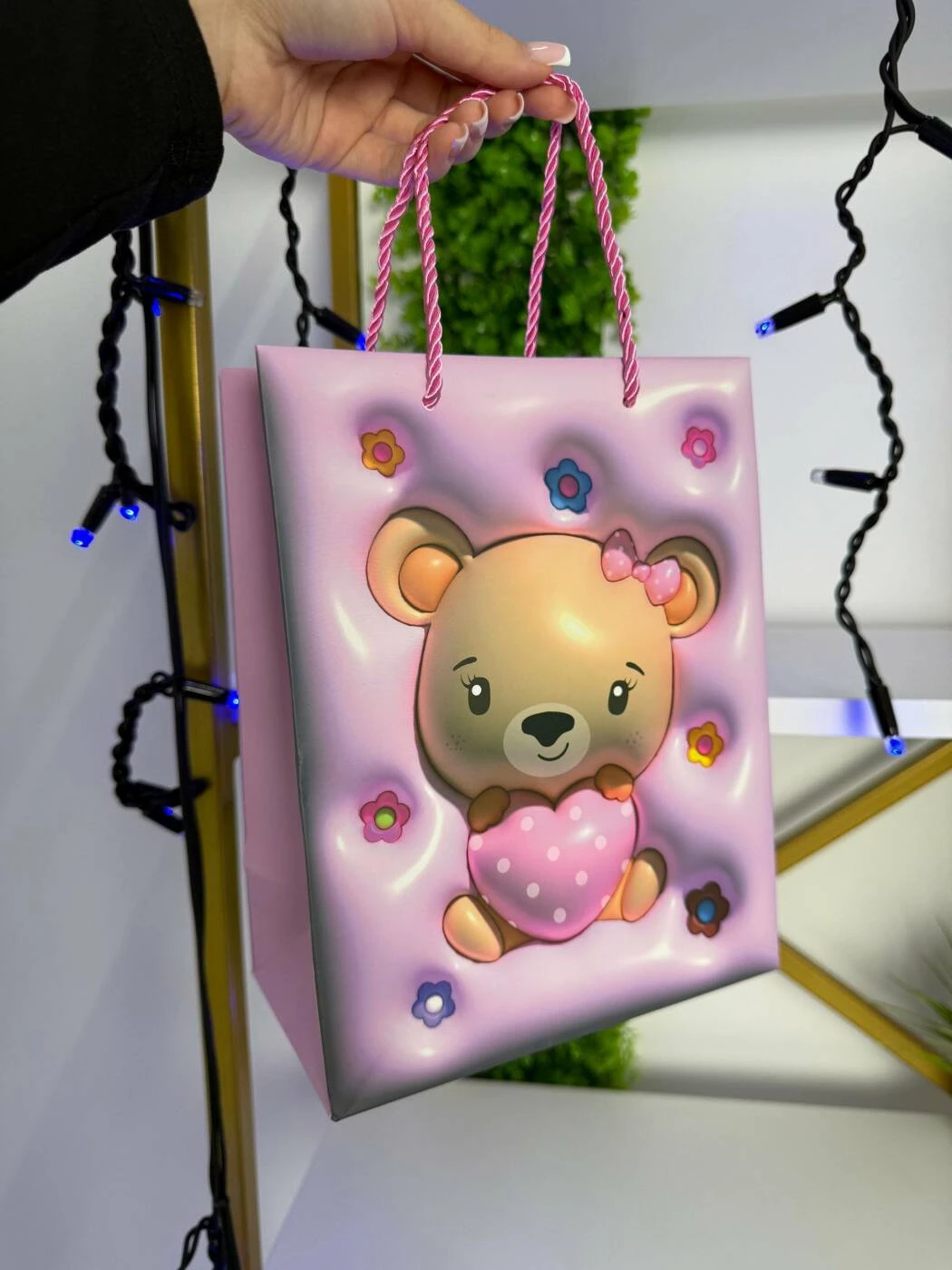 Această pungă cadou adorabilă este decorată cu un ursuleț drăgălaș care ține o inimioară roz cu buline, înconjurat de floricele colorate. Fundalul în nuanțe pastelate de roz și lila creează un efect luminos și delicat, perfect pentru cadouri oferite cu dragoste și afecțiune.