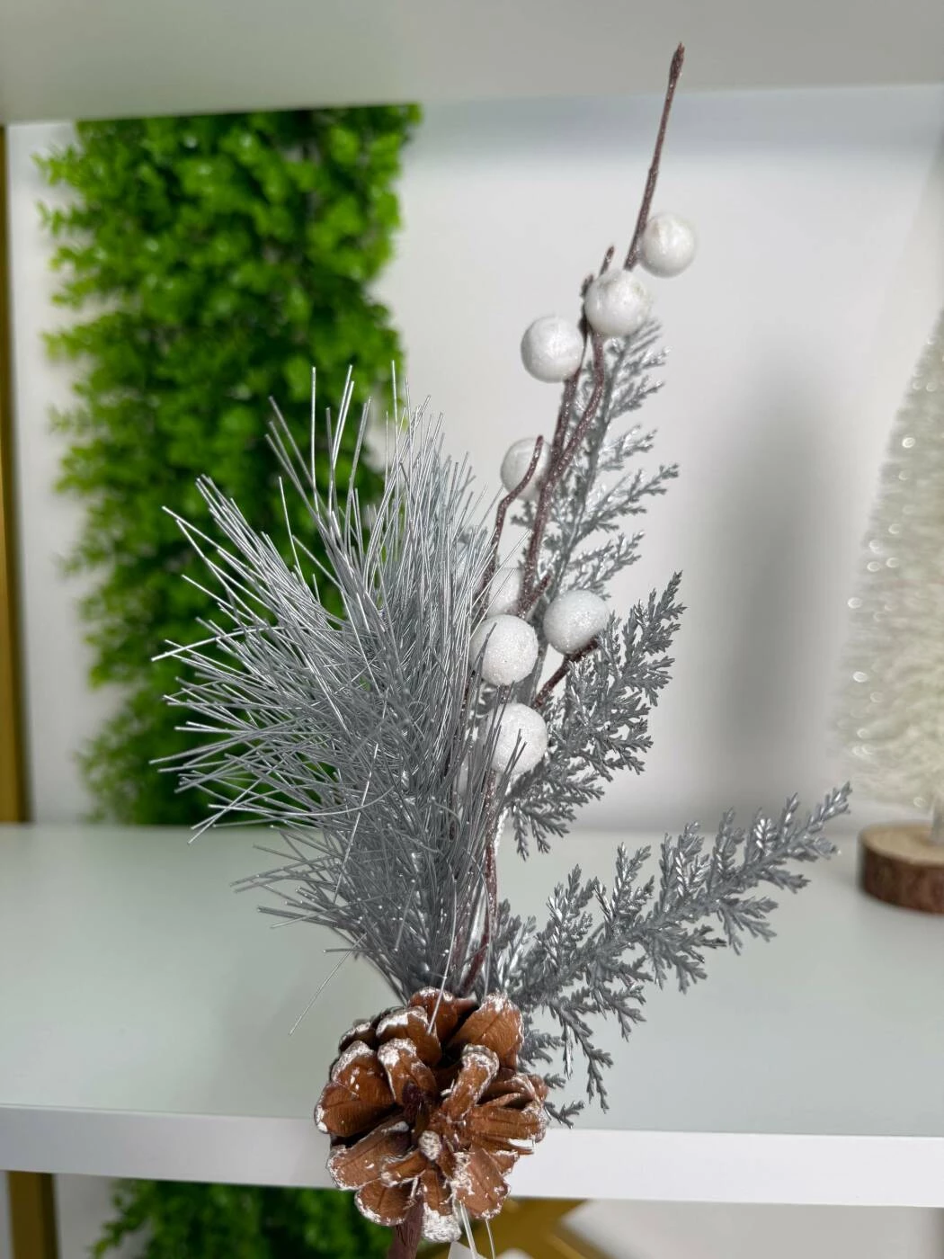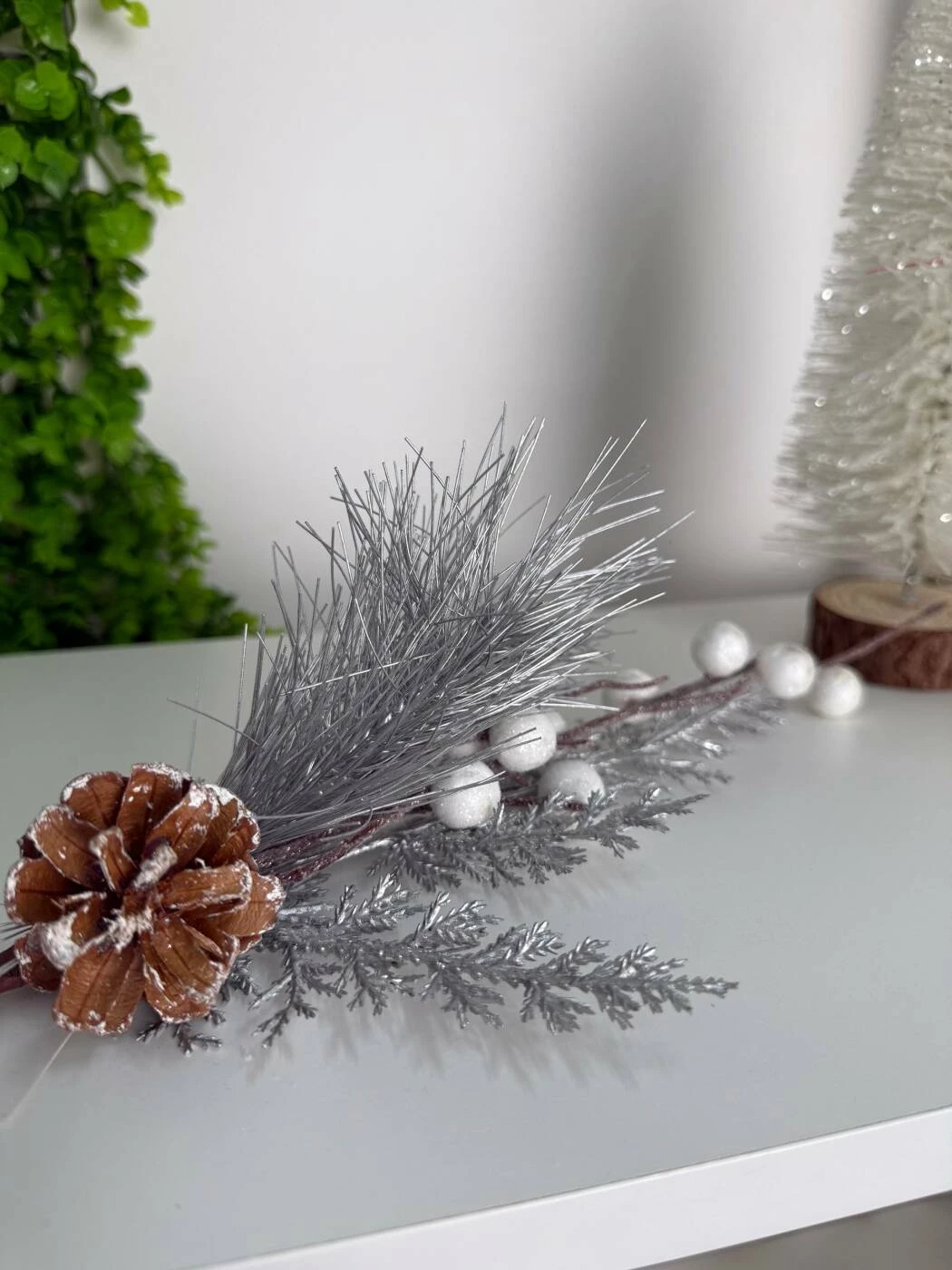 Această ramură decorativă elegantă adaugă un strop de rafinament oricărui aranjament de Crăciun. Realizată cu detalii fine, con, bobițe albe și frunze argintii, emană un farmec festiv subtil și modern.