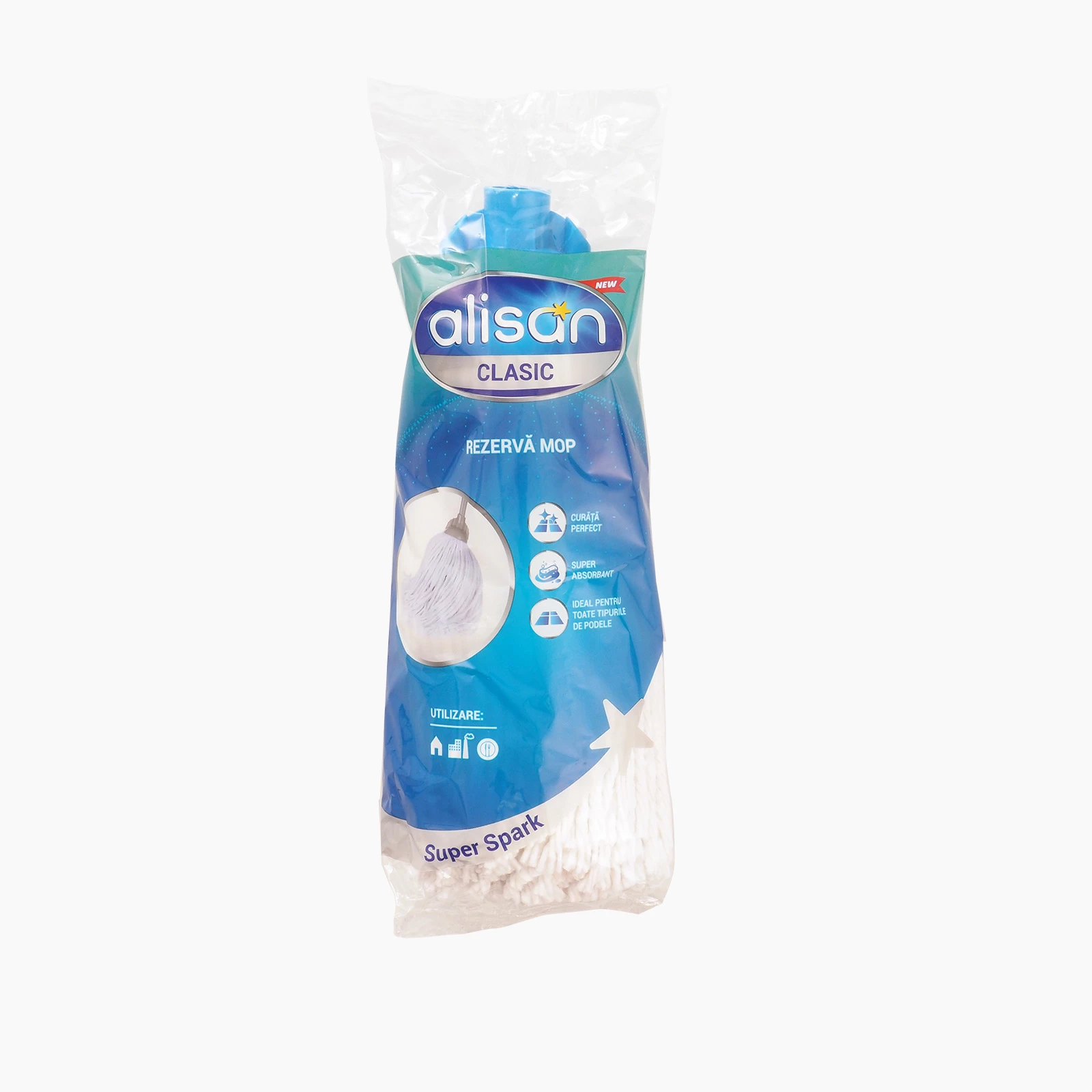 Mop din fire albe de bumbac, rezistent, ușor de folosit, ce asigură o absorbție ridicată.curăță ușor, fără să lase urme;filet conic din plastic ce se adaptează oricărui tip de mâner.