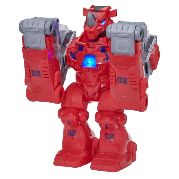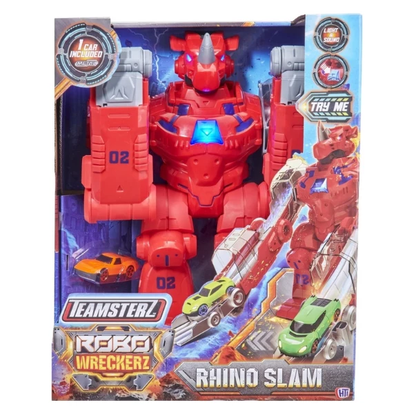 Intră în acțiune cu robotul-rinocer Rhino Slam! Deschide brațele robotului, încarcă mașinuțele și apasă pe cap – vehiculele vor fi lansate de ambele brațe pe pistă, trecând prin panouri transparente pentru a urmări cursa rapidă. Rhino Slam scoate sunete realiste de rinocer și robot, iar ochii LED strălucesc pregătiți de atac!