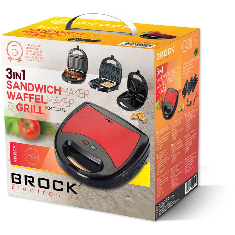 Sandwich Maker BROCK SSM 2003 RD, 750W, 3 in 1 functions (sandwich maker, waffle maker and grill), Length of the power cord 75 cm