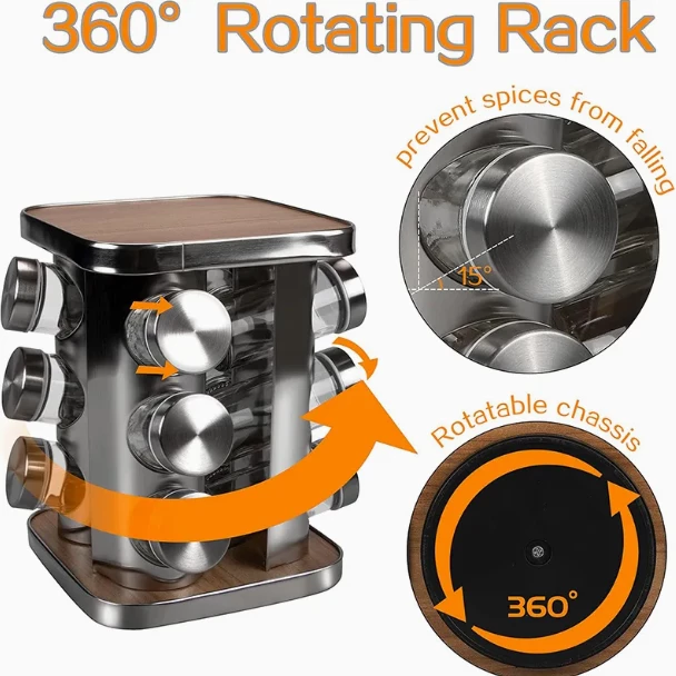 Acest set practic conține 12 recipiente pentru condimente, montate pe un suport rotativ la 360°, care permite acces rapid și organizat la toate mirodeniile tale preferate. Recipienții sunt confecționați din sticlă rezistentă, cu capace metalice ce previn scurgerea sau pierderea aromei. Suportul compact, realizat din metal și lemn, ocupă puțin spațiu și se potrivește perfect în orice bucătărie modernă.