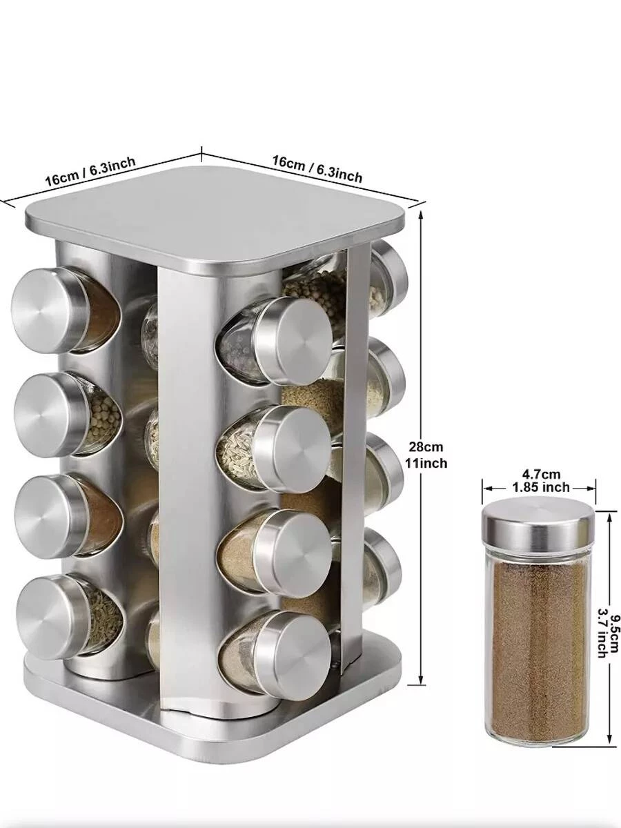 Setul de 16 recipiente pentru condimente cu suport rotativ pătrat este soluția perfectă pentru organizarea bucătăriei tale. Fiecare borcănel este prevăzut cu capac metalic și sită pentru dozarea optimă a condimentelor. Suportul rotativ la 360° permite acces rapid și ușor la toate condimentele, economisind spațiu pe blat și oferind un aspect elegant. Fabricat din inox de calitate și sticlă rezistentă, acest set este durabil și practic.