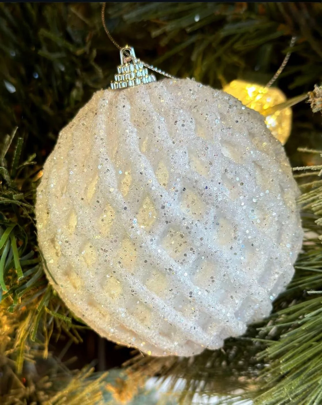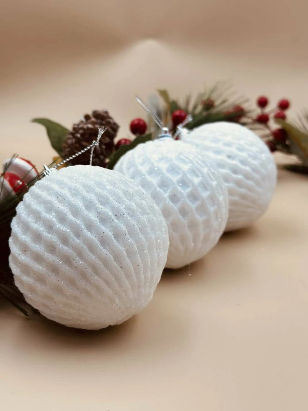 Aceste globuri decorative elegante aduc un plus de rafinament și lumină bradului de Crăciun. Realizate într-un design texturat modern, cu finisaj sclipitor, globurile albe se integrează perfect în decorurile de iarnă, oferind un efect vizual deosebit prin reflexia luminii.