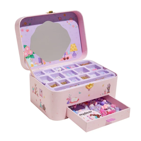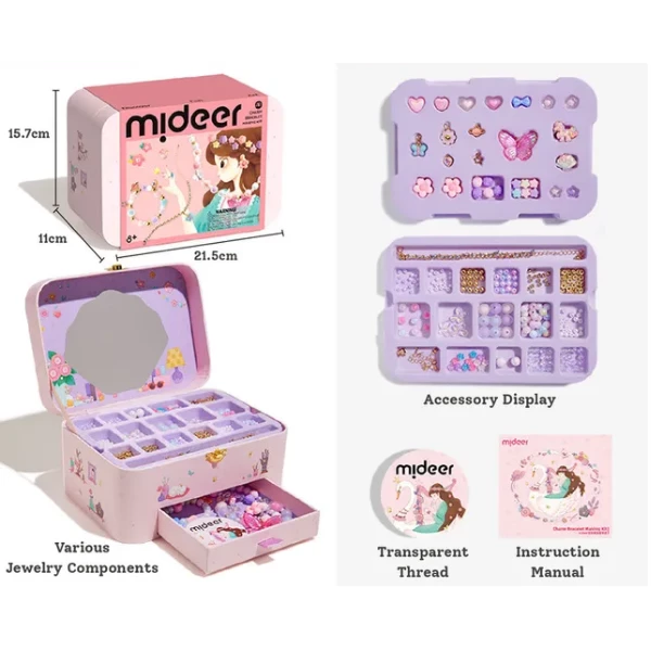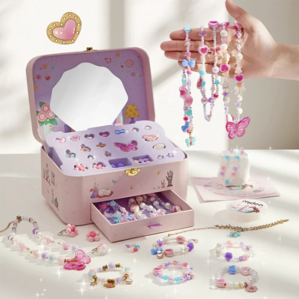 Acest set permite copiilor să creeze accesorii unice — coliere, brățări, inele și cercei — și să le păstreze în cutia specială. Procesul este simplu și distractiv:
