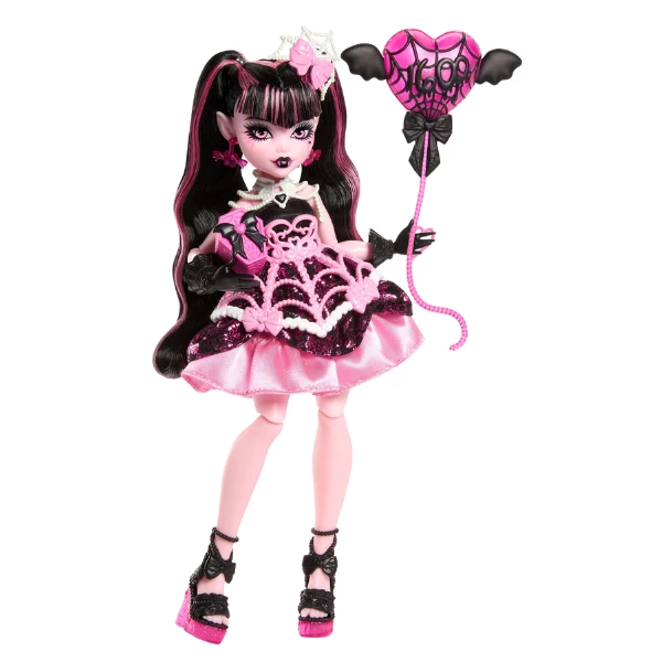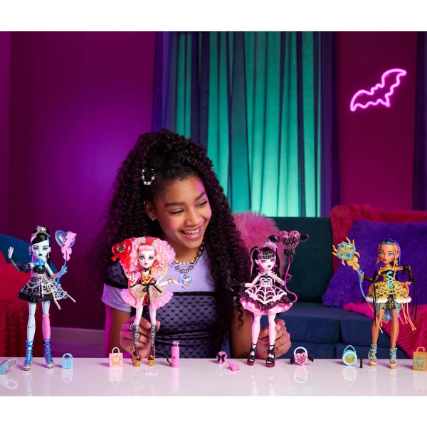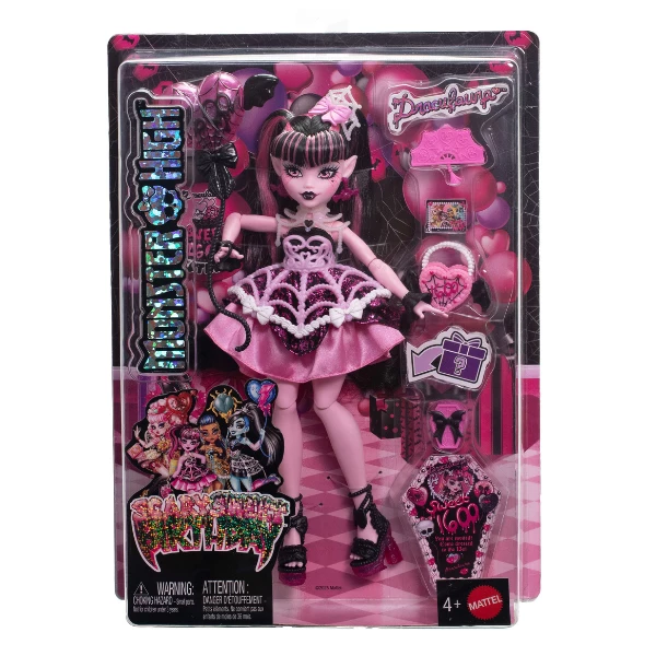 Draculaura organizează o petrecere Scary Sweet Birthday, cea mai dulce și înfricoșătoare celebrare a secolului! Nu în fiecare zi o monstruletă împlinește 1600 de ani, așa că o petrecere magică este modul perfect de a marca ocazia. Fiecare păpușă din serie poartă o ținută festivă și vine cu accesorii precum baloane, invitații, felicitări, cadouri și multe altele. Cu atâtea detalii adorabile, această petrecere va fi cu siguranță una de neuitat!
