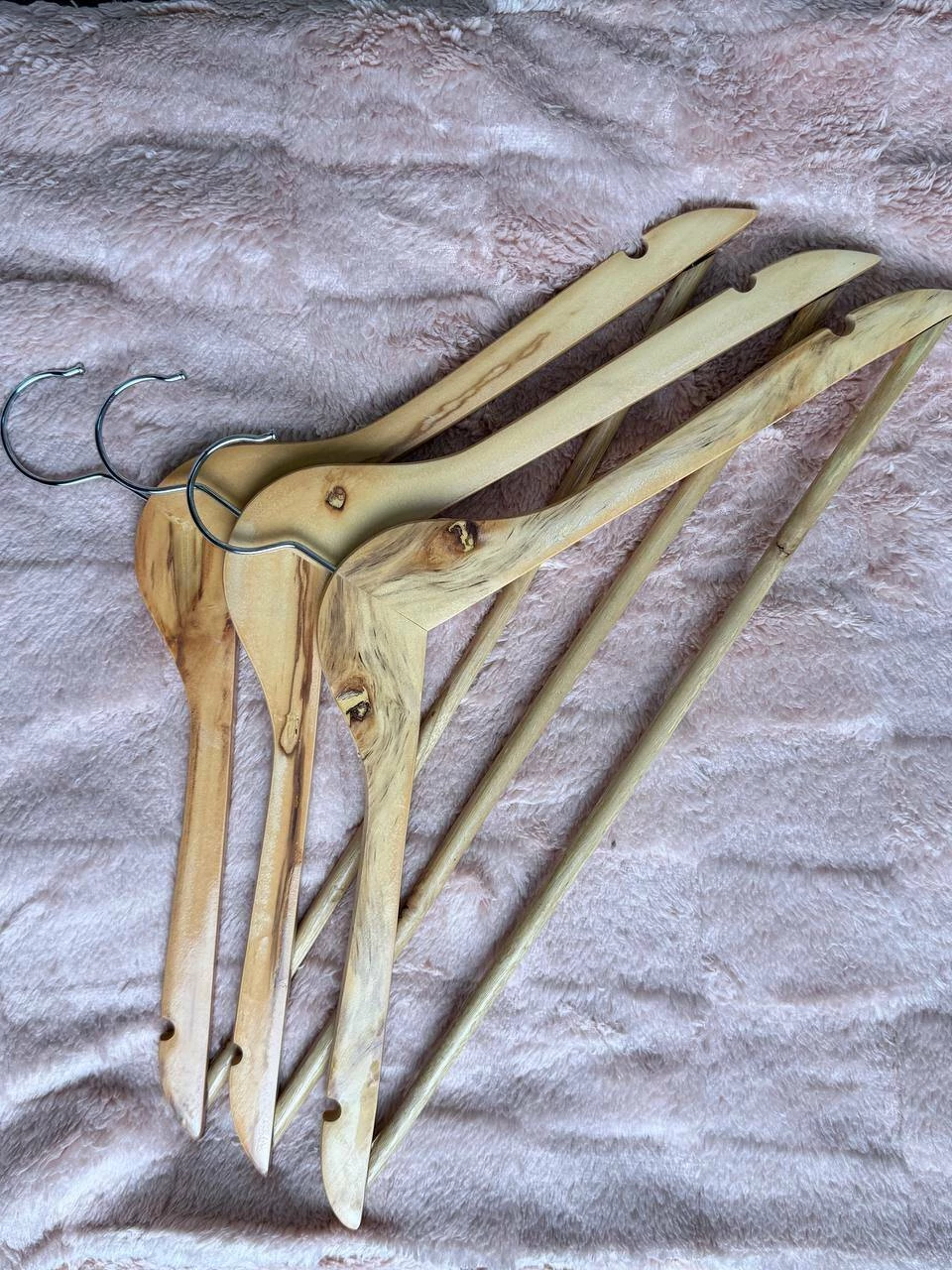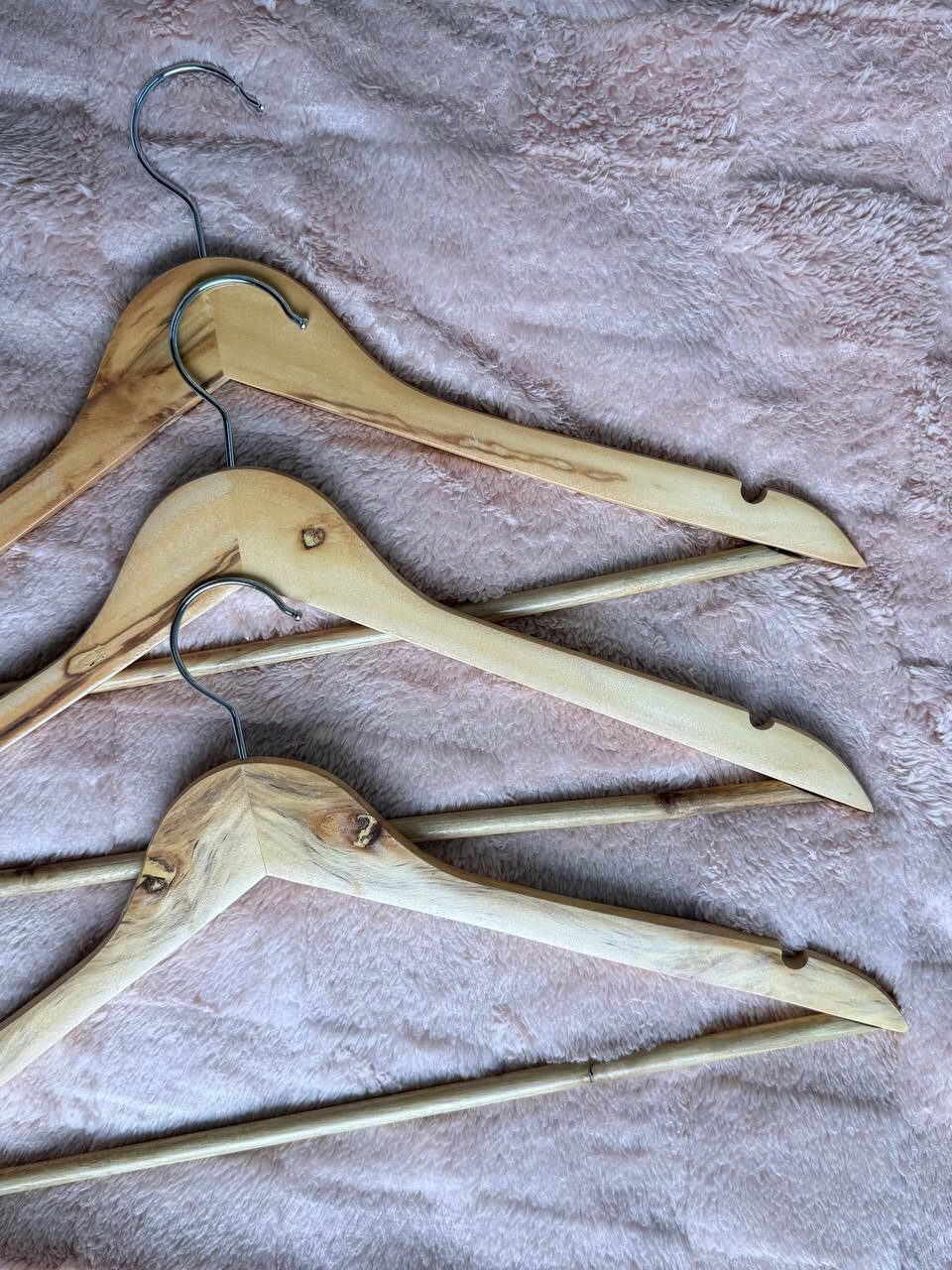 Set de 3 umerașe din lemn natural, rezistente și elegante, ideale pentru haine, paltoane sau pantaloni. Umerașele au un design simplu și robust, cu bară transversală pentru pantaloni, oferind stabilitate și durabilitate în utilizare zilnică.