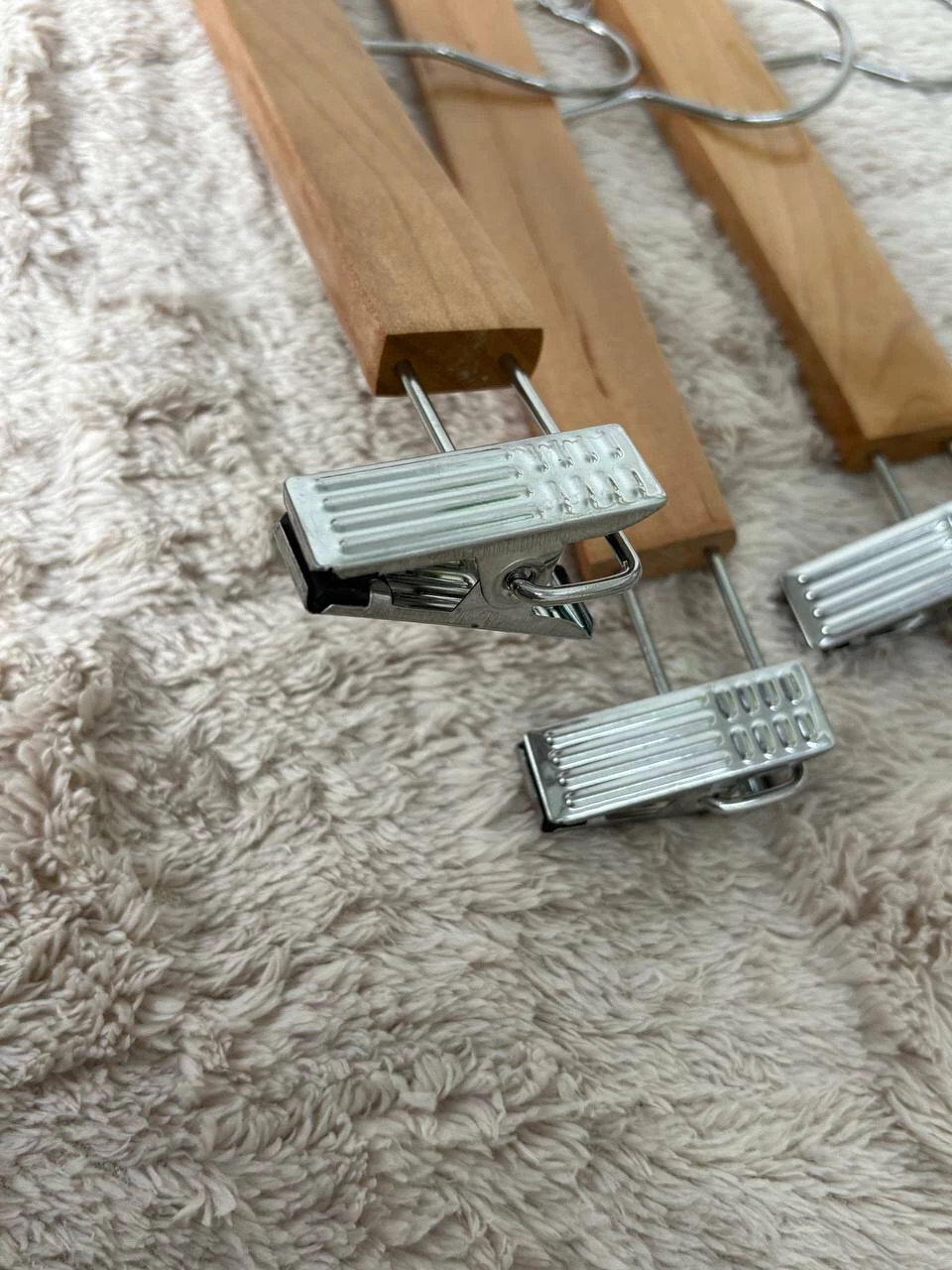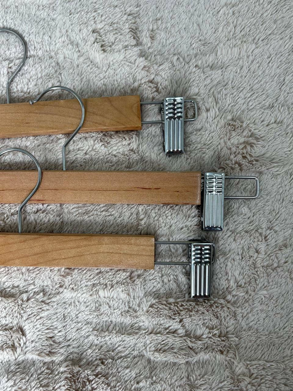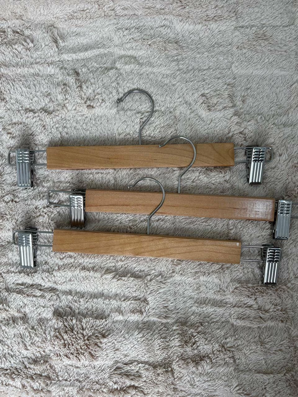 Umerașe din lemn cu cleme metalice rezistente, ideale pentru pantaloni, fuste sau alte articole vestimentare. Clemele fixează ferm hainele, păstrându-le întinse și ordonate. Designul lor elegant și durabil face ca acești umerași să fie alegerea perfectă pentru garderoba ta.