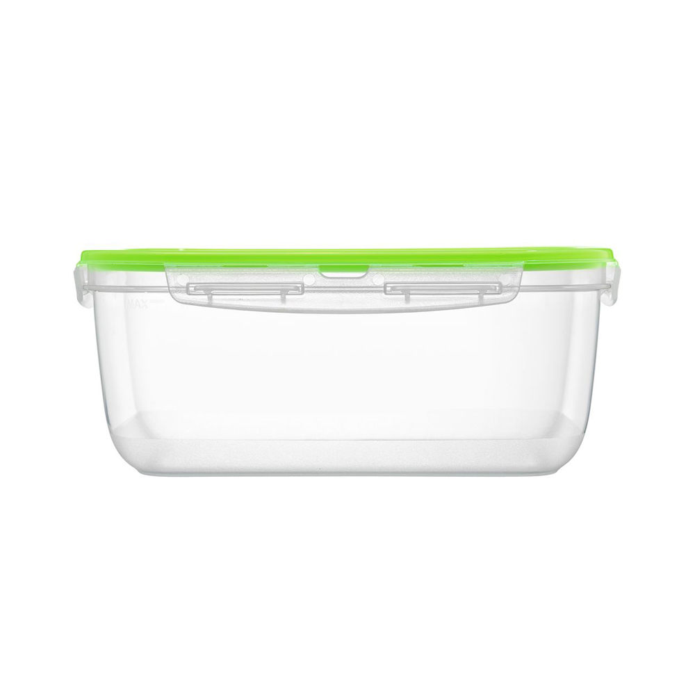 Recipientul este compatibil si cu masina de spalat vase, fiind recomandata plasarea acestuia pe raftul superior pentru o curatare sigura si eficienta. Designul sau transparent cu accente verzi permite vizualizarea usoara a continutului, facilitand organizarea alimentelor.