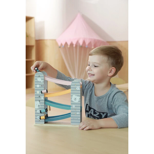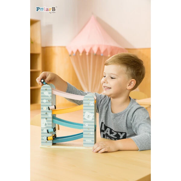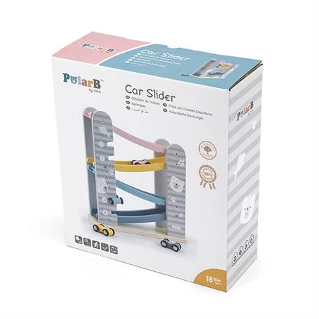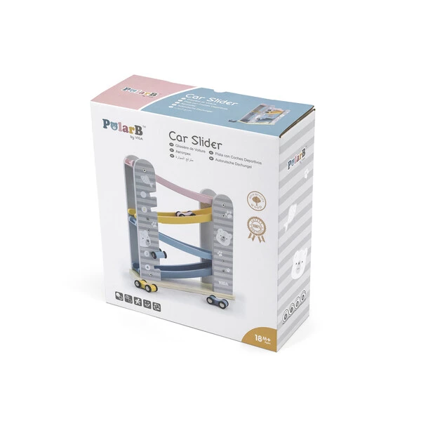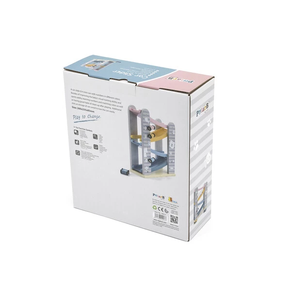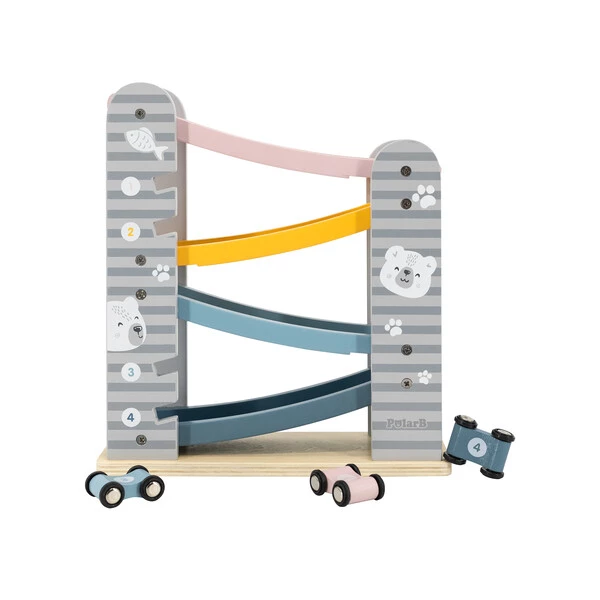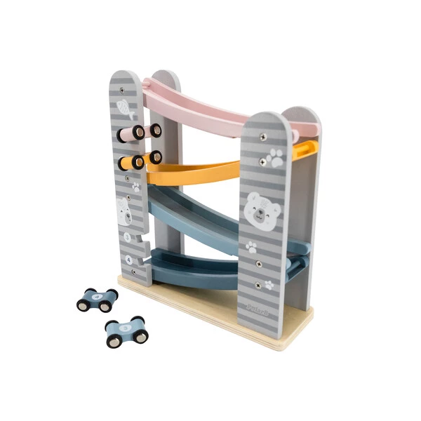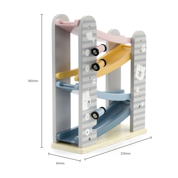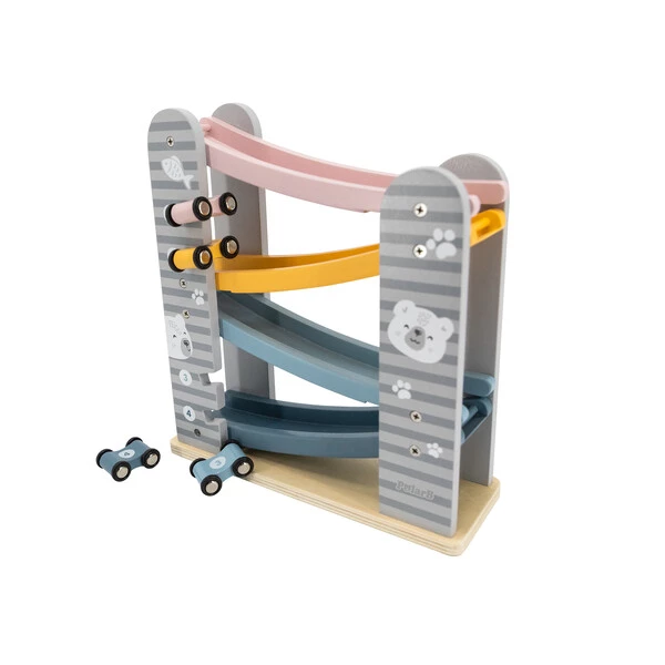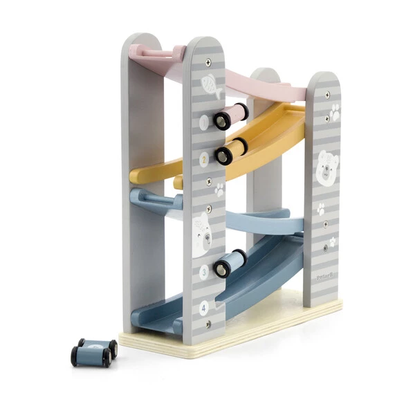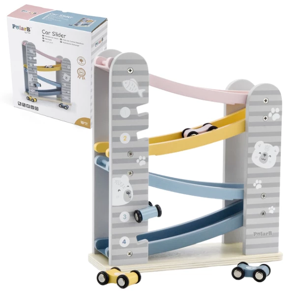 Он состоит из 4-уровневого автотрека с разноцветными дорожками, по которым ловко маневрируют 4 небольшие машинки. Они легко скользят вверх-вниз и плавно ездят по гладким поверхностям. Мини-автомобили крепятся к боковым планкам трека, где их удобно хранить.Пастельная расцветка, идеальная шлифовка дерева и лаконичный дизайн с неброскими рисунками делают эту развивающую игрушку невероятно привлекательной для детей и взрослых – как визуально, так и тактильно.
