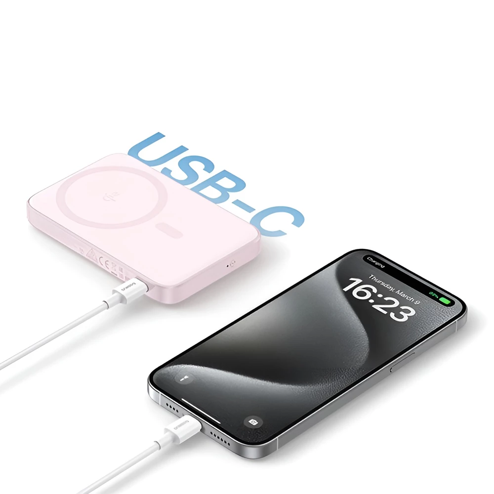 Baseus Power Bank Qi2 permite incarcarea simultana a doua dispozitive – unul prin conexiune wireless si altul prin cablu Type-C inclus (lungime 0.3m). Astfel, poti alimenta atat iPhone-ul, cat si un alt gadget compatibil, economisind timp si spatiu.