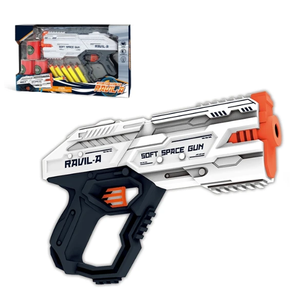 Бластер с мягкими пулями присосками, не имеет посторонних запахов. Ваш ребенок сможет научиться точно попадать в цель, при этом будет развивать меткость и координацию, внимание и смекалку.