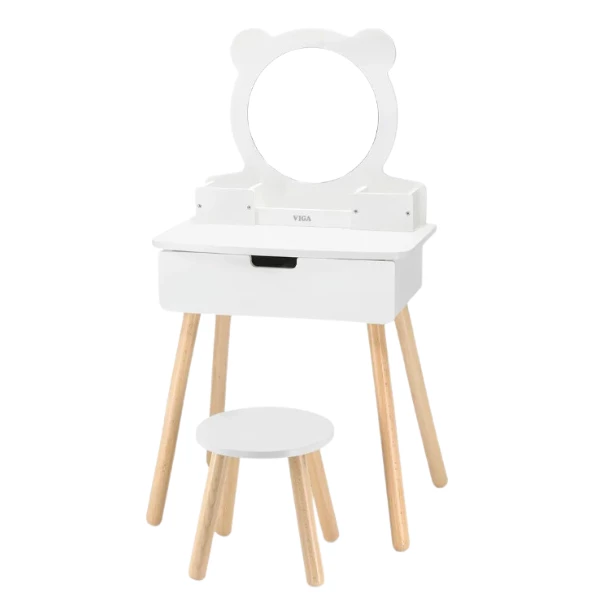 Большой белый туалетный столик от Viga – это мечта каждой маленькой принцессы! Он идеально дополнит детскую комнату, создавая уютный уголок для игр. В столике есть выдвижной ящик, куда ребенок может складывать свои маленькие сокровища. Под зеркалом расположены удобные отделения для хранения аксессуаров, а в комплекте также идет стильный белый стульчик. Все элементы выполнены из дерева и окрашены безопасными для детей и экологии нетоксичными красками.
